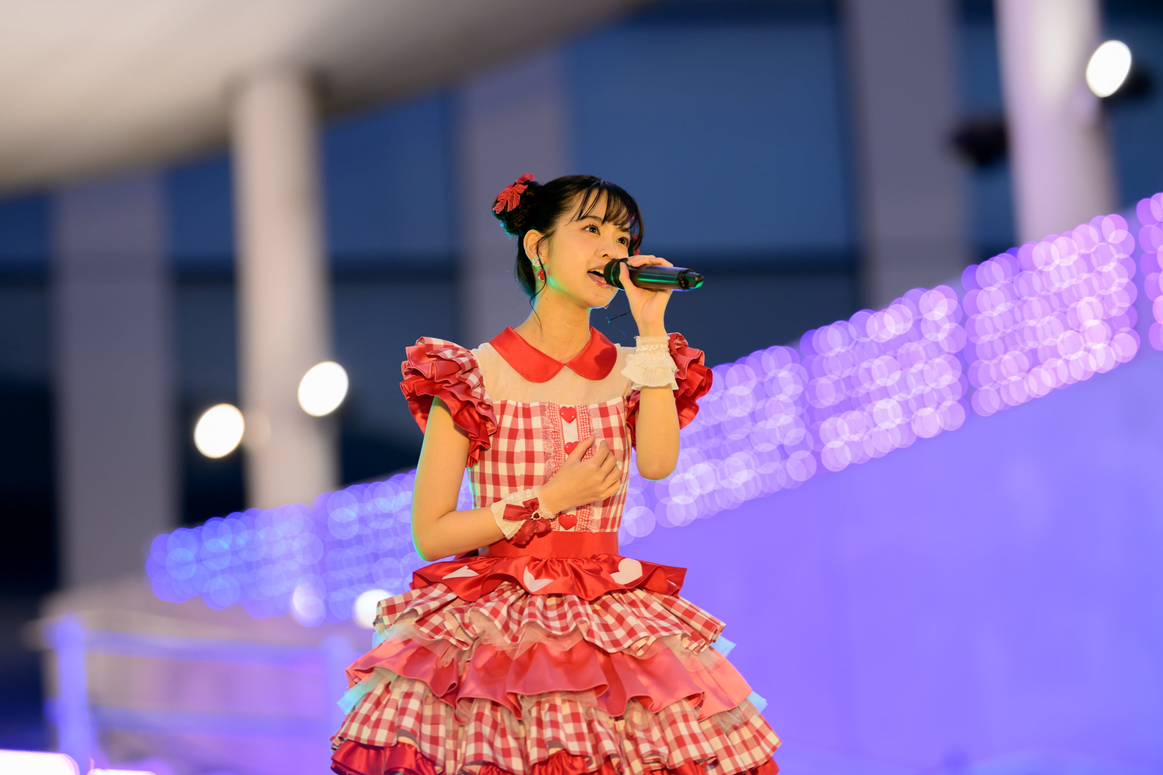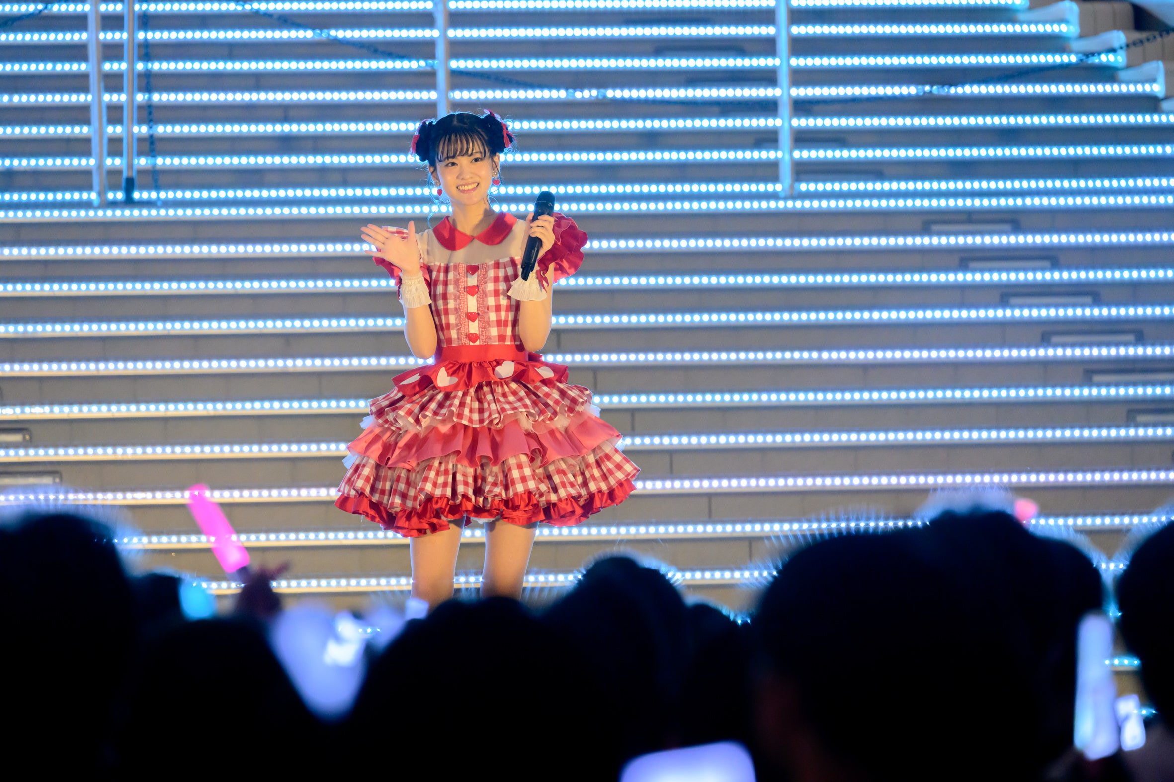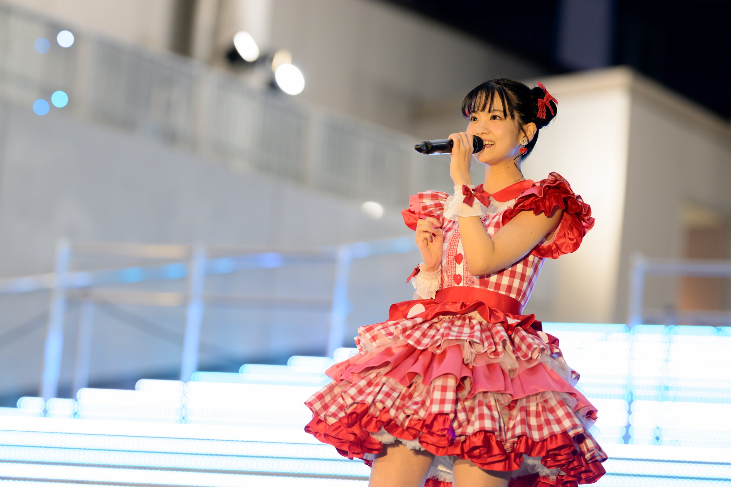 日が沈んだ屋外のイベントスペースに、赤いチェック柄のかわいい衣装で登場した大西亜玖璃に、観客からは「あぐぽん!」という呼びかけと大きな拍手が起こる。