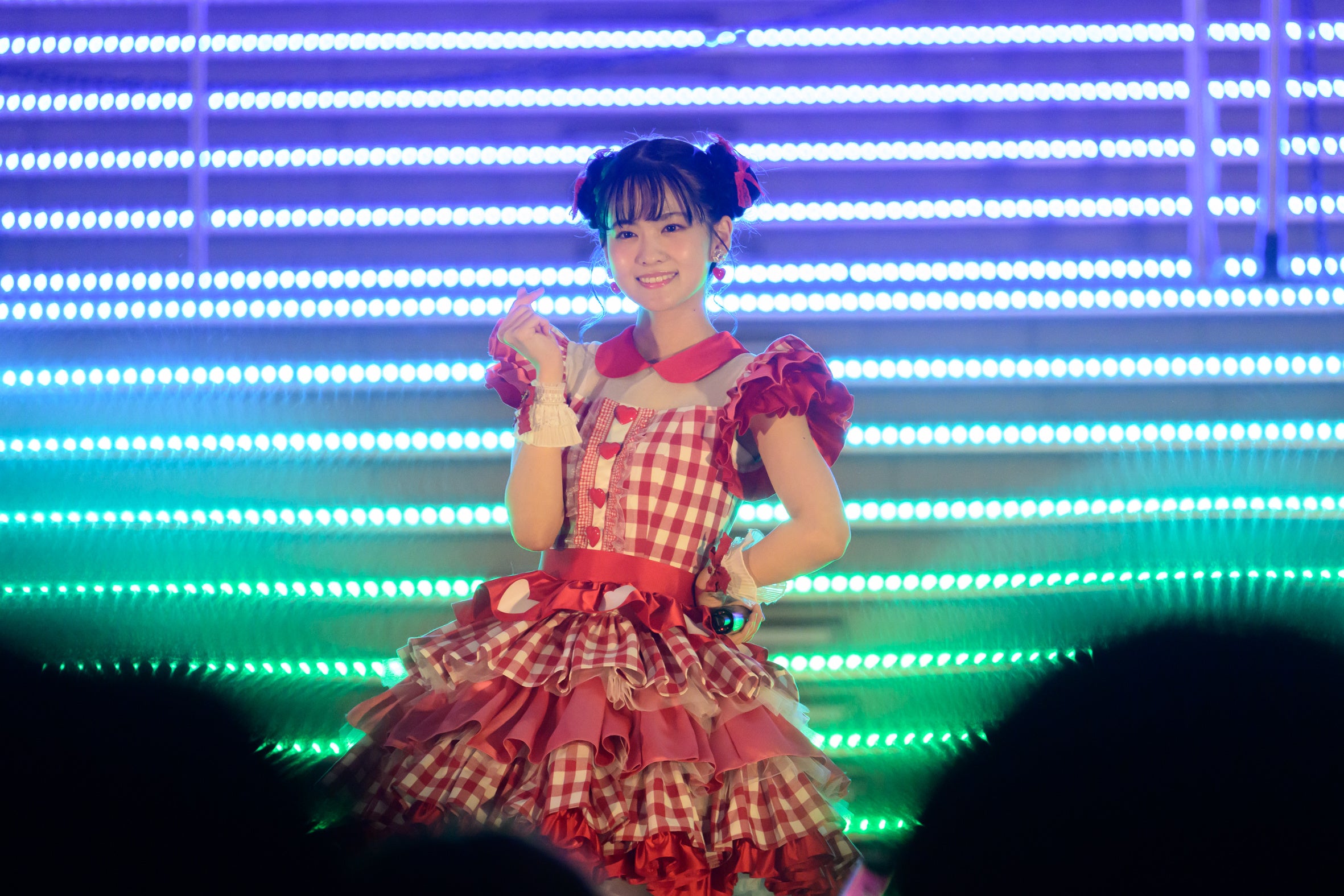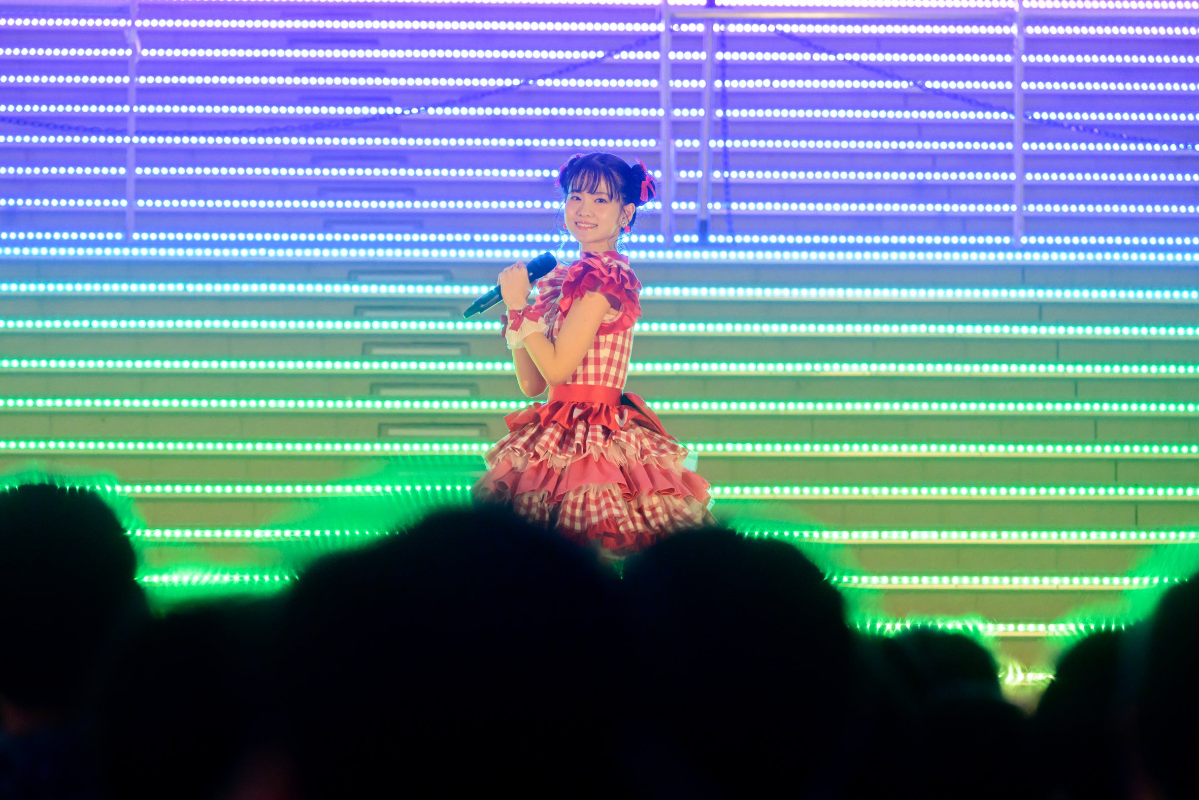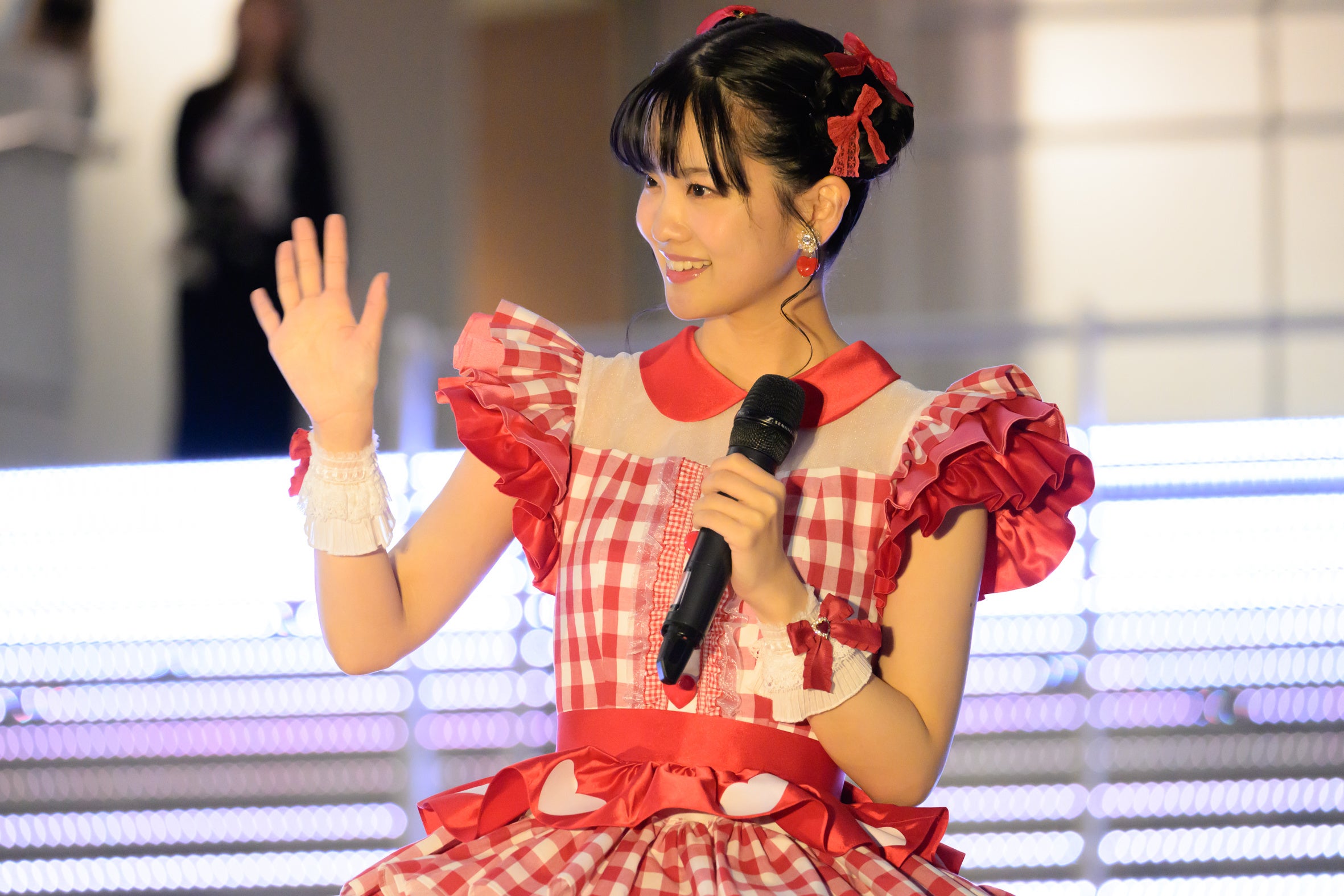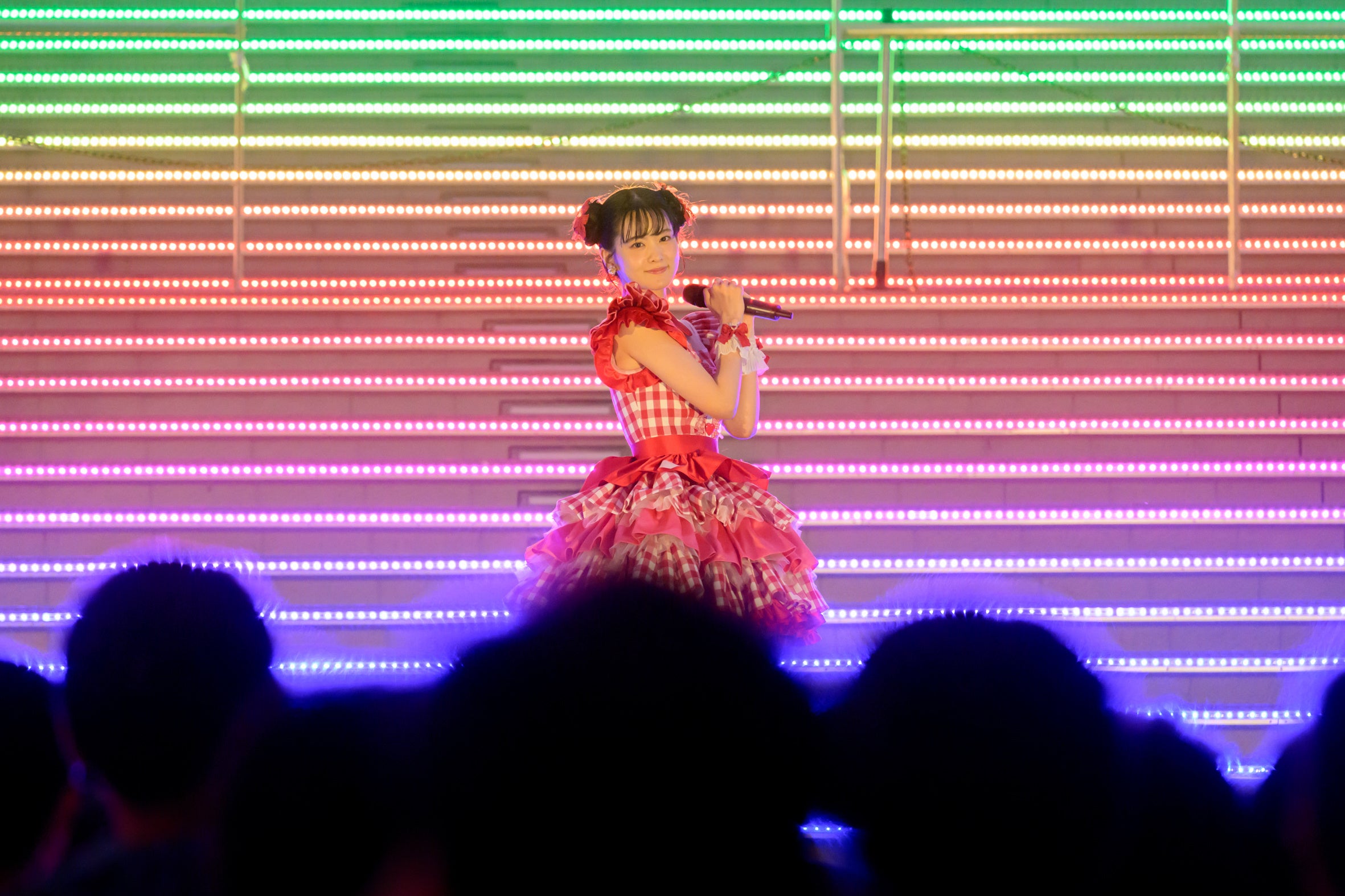日が沈んだ屋外のイベントスペースに、赤いチェック柄のかわいい衣装で登場した大西亜玖璃に、観客からは「あぐぽん!」という呼びかけと大きな拍手が起こる。