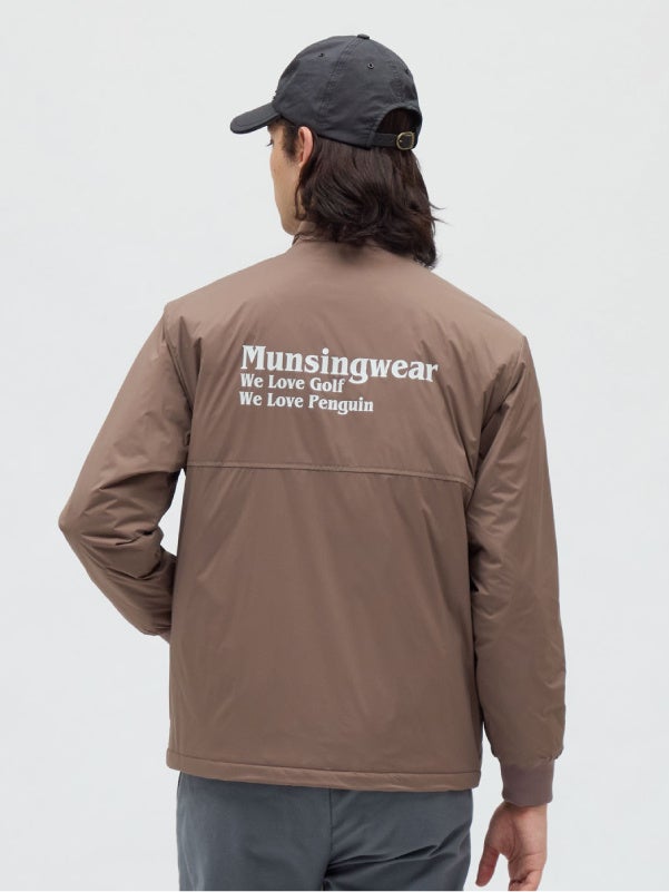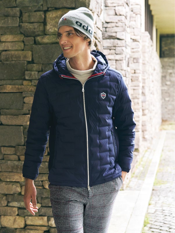 薄手のナイロン素材とキルティング裏地を組み合わせた保温性に優れたブルゾンです。背面のロゴプリントがデザインのポイントになっています。ゴルフシーンだけでなく、普段使いにも活躍する汎用性の高いアイテムです。
