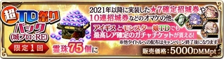 キャンペーン期間中、招城儀式に使える霊珠75個に加えて、2021年以降に招城儀式に追加された★7城娘1体が確定で手に入る『招城券(★7確定 第一回TD祭り)』や超お得な育成アイテムなどの豪華特典がついてくる『超TD祭りパック(城プロ:RE)』を販売いたします!