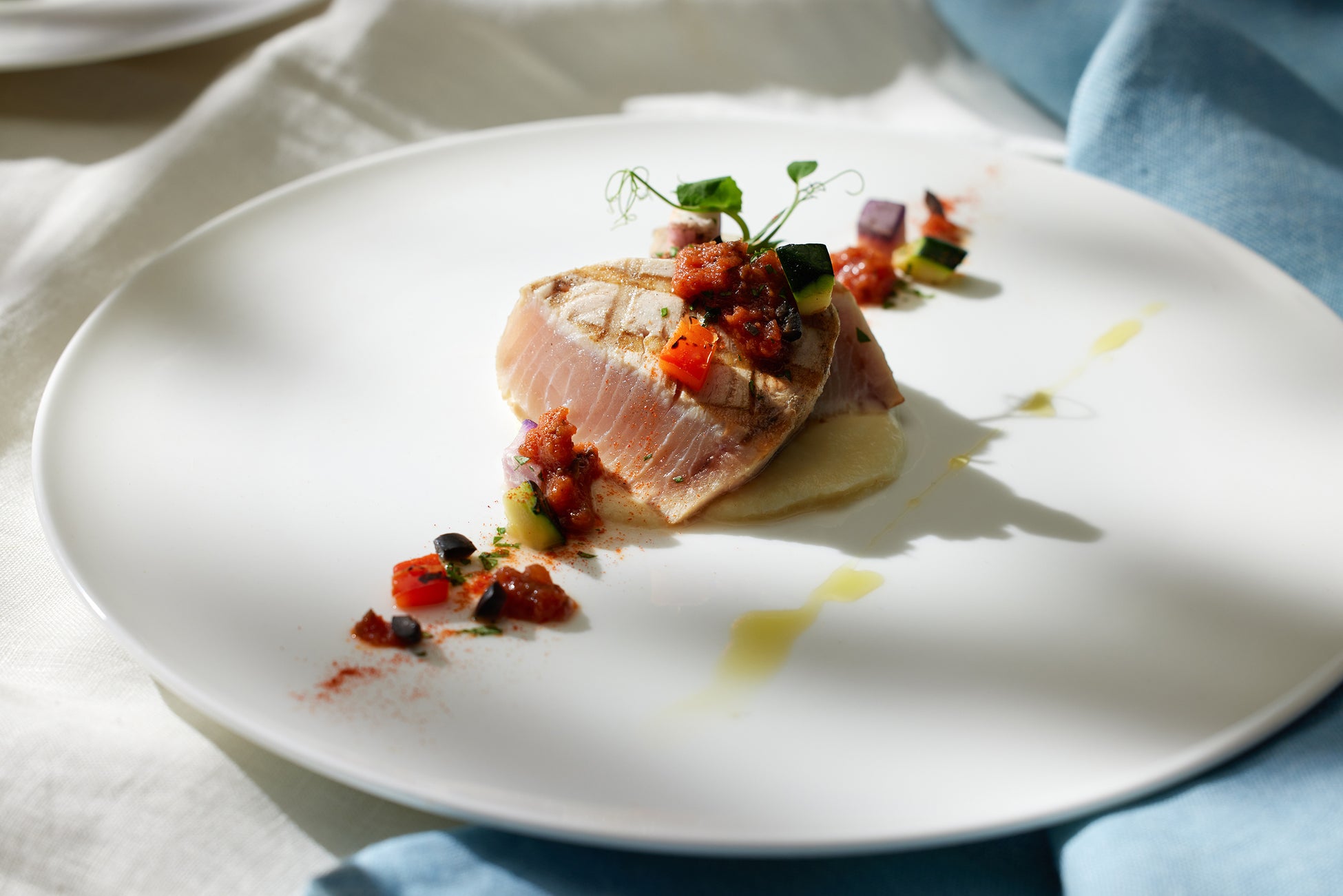 前菜には、色鮮やかな初夏の花畑をイメージした「コールドビーフ&チキン 夏野菜の生春巻き ソース・ヴェルト」をご用意します。ビーツとターメリックでそれぞれ色付けされたライスペーパーで、コールドビーフ・チキン・夏野菜・エディブルフラワーを包んだ上品ながらもボリューム満点の一品です。葉野菜のピュレをベースに仕立てたグリーンカラーが際立つソース・ヴェルトと合わせてお召し上がりください。メインディッシュのおすすめは「カジキマグロのグリル サルサソース」です。表面は香ばしく、中はしっとりとレアに焼き上げ、特製のサルサソースと合わせました。肉厚で優しい味わいのカジキマグロと、辛味と酸味のあるサルサソースのコンビネーションをご堪能ください。