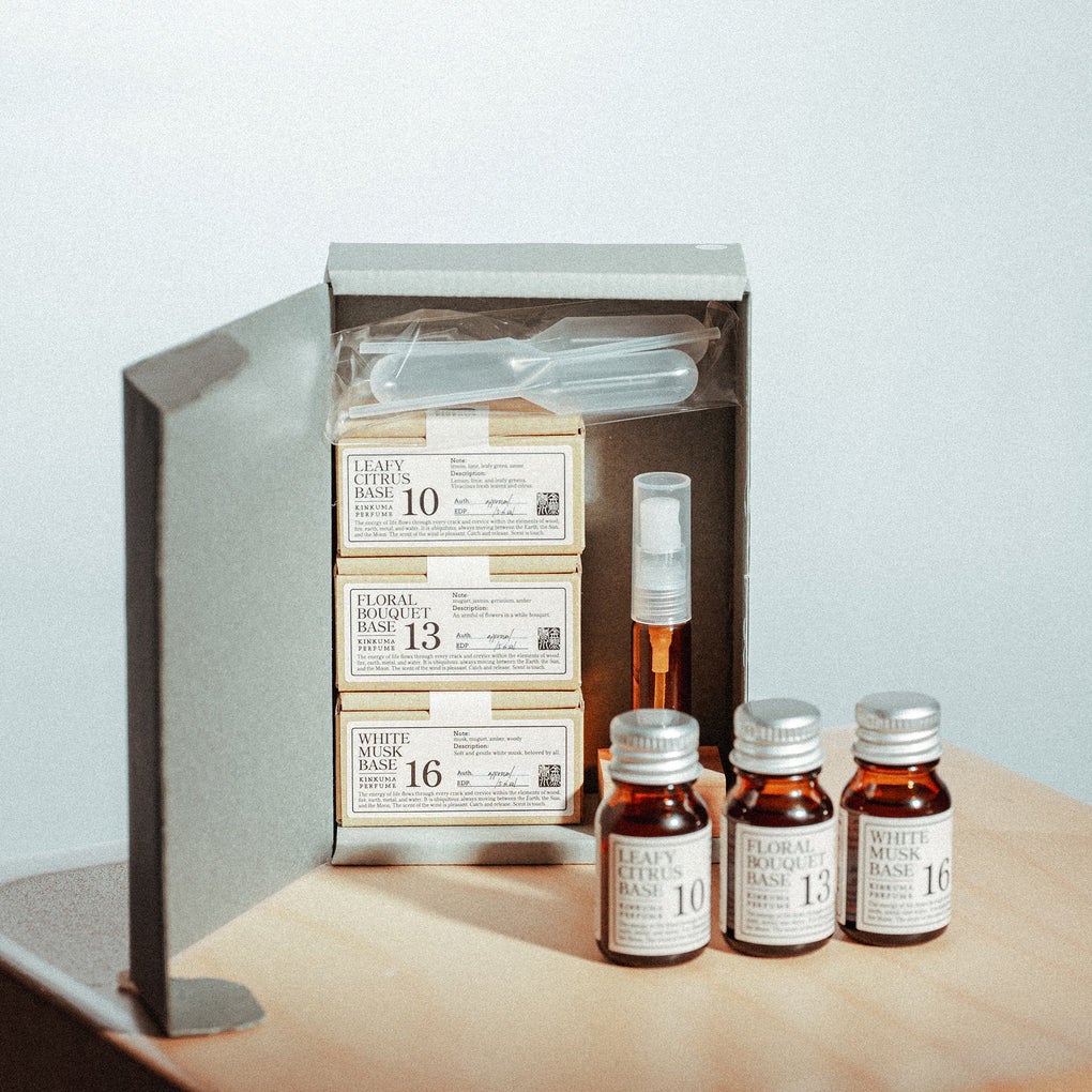 オリジナルブレンドに使用されている金熊ベース10mlサイズを、3本選んでご購入いただけます。その日の気分やシーンに合わせて、お好みで配合することで『じぶんだけのかおり』をつくってお楽しみいただけます。