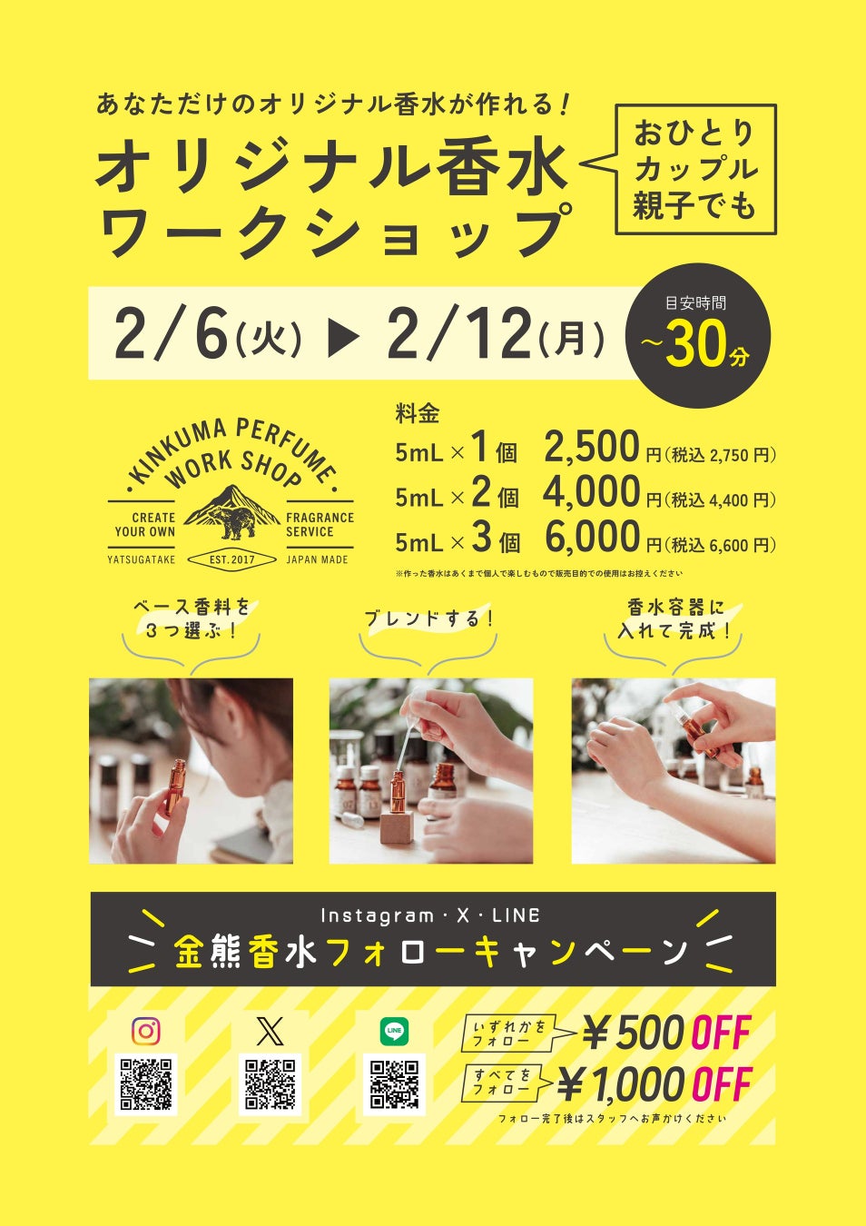ポップアップストアの開催期間中に「金熊香水」のInstagram、X(旧Twitter)、公式LINEのいずれかをフォローで、ワークショップのご利用が500円OFF、さらにすべてをフォローすると1,000円OFF‼