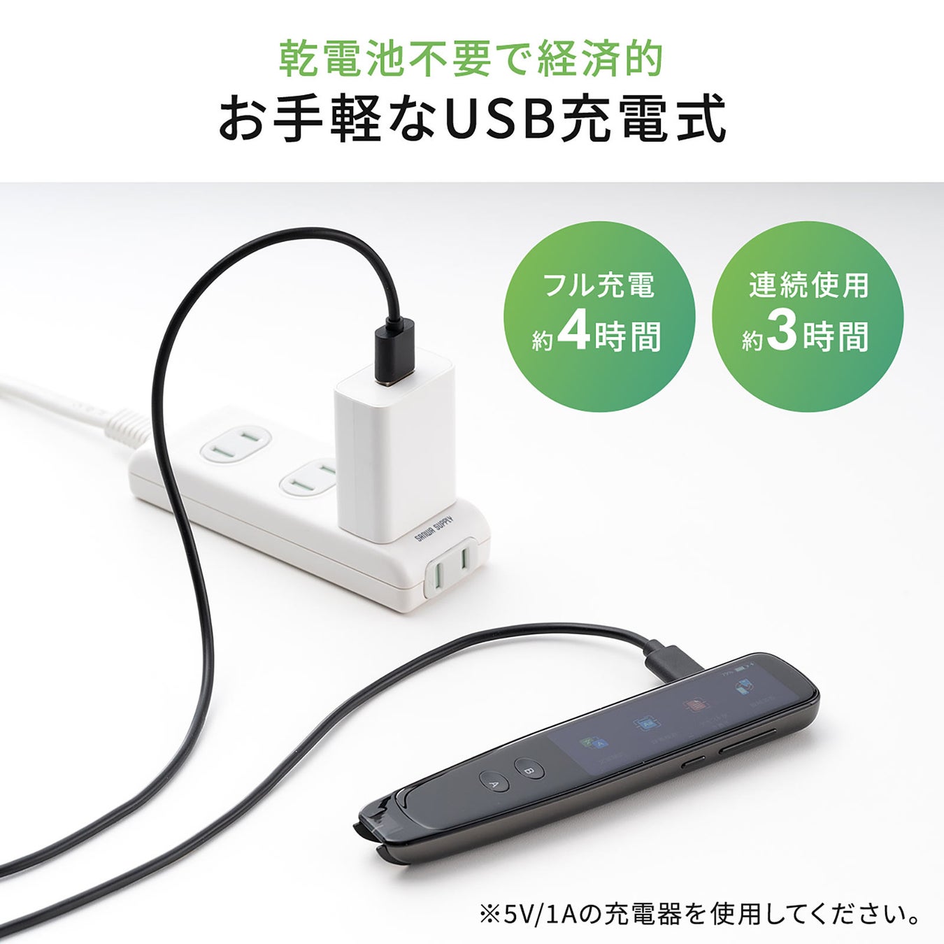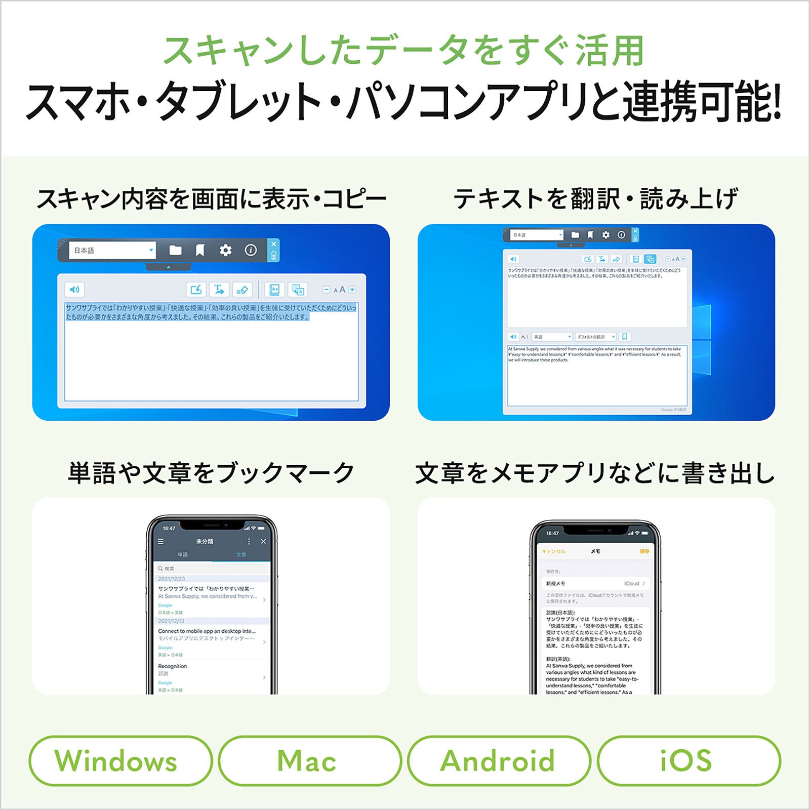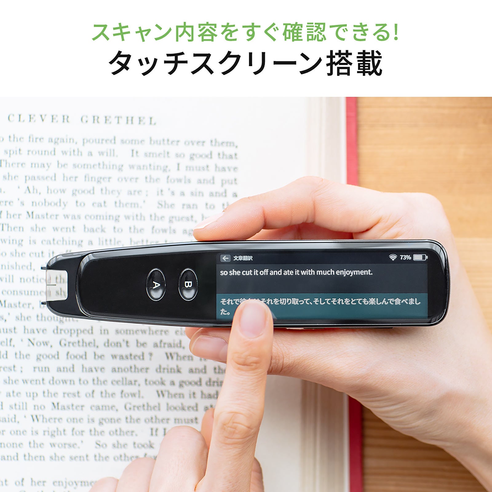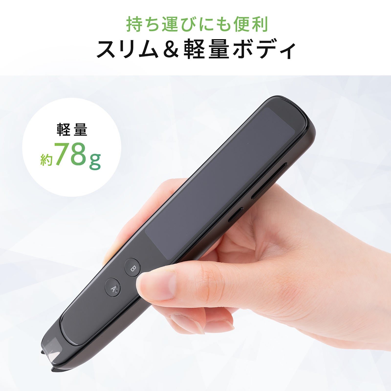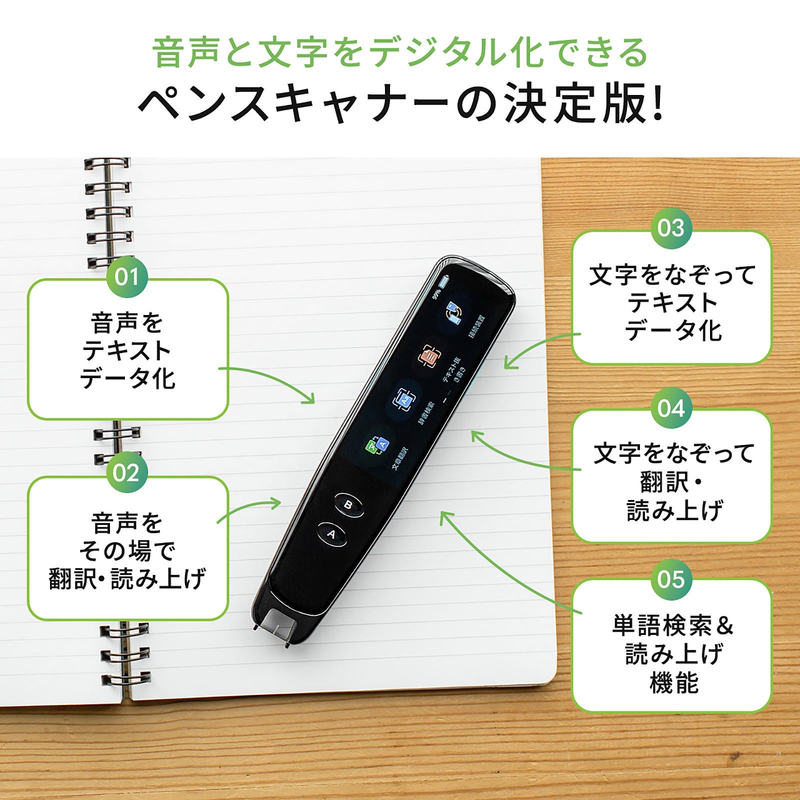 サンワサプライ株式会社(本社:岡山市北区田町1-10-1、 代表取締役社長 山田 和範)が運営している直販サイト『サンワダイレクト』では、喋った内容を録音、テキストデータ化、翻訳、発音をすることが可能で、文字をなぞるだけでテキストデータ化、翻訳、発音、単語検索をすることができるボイスレコーダー機能がついたタッチパネル式のペン型スキャナ「400-SCN060」を発売しました。