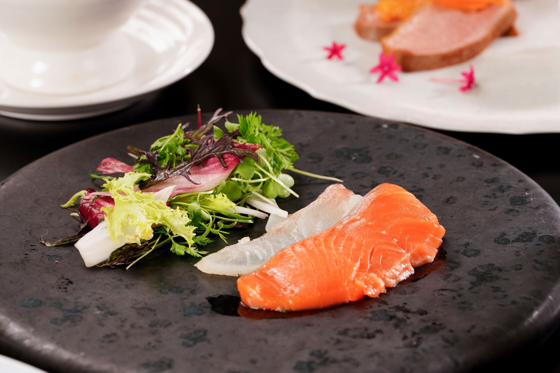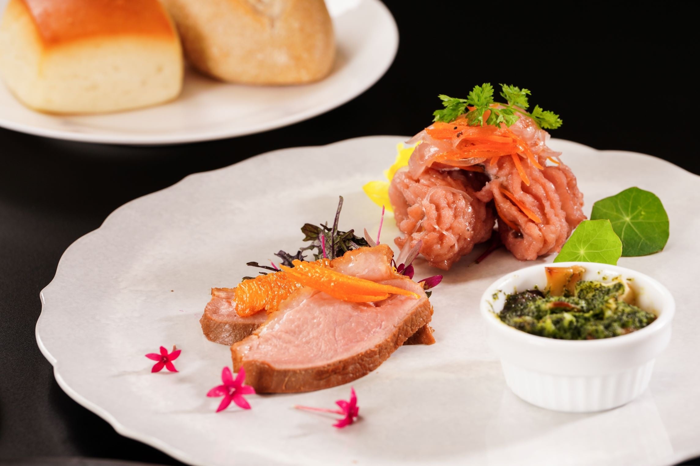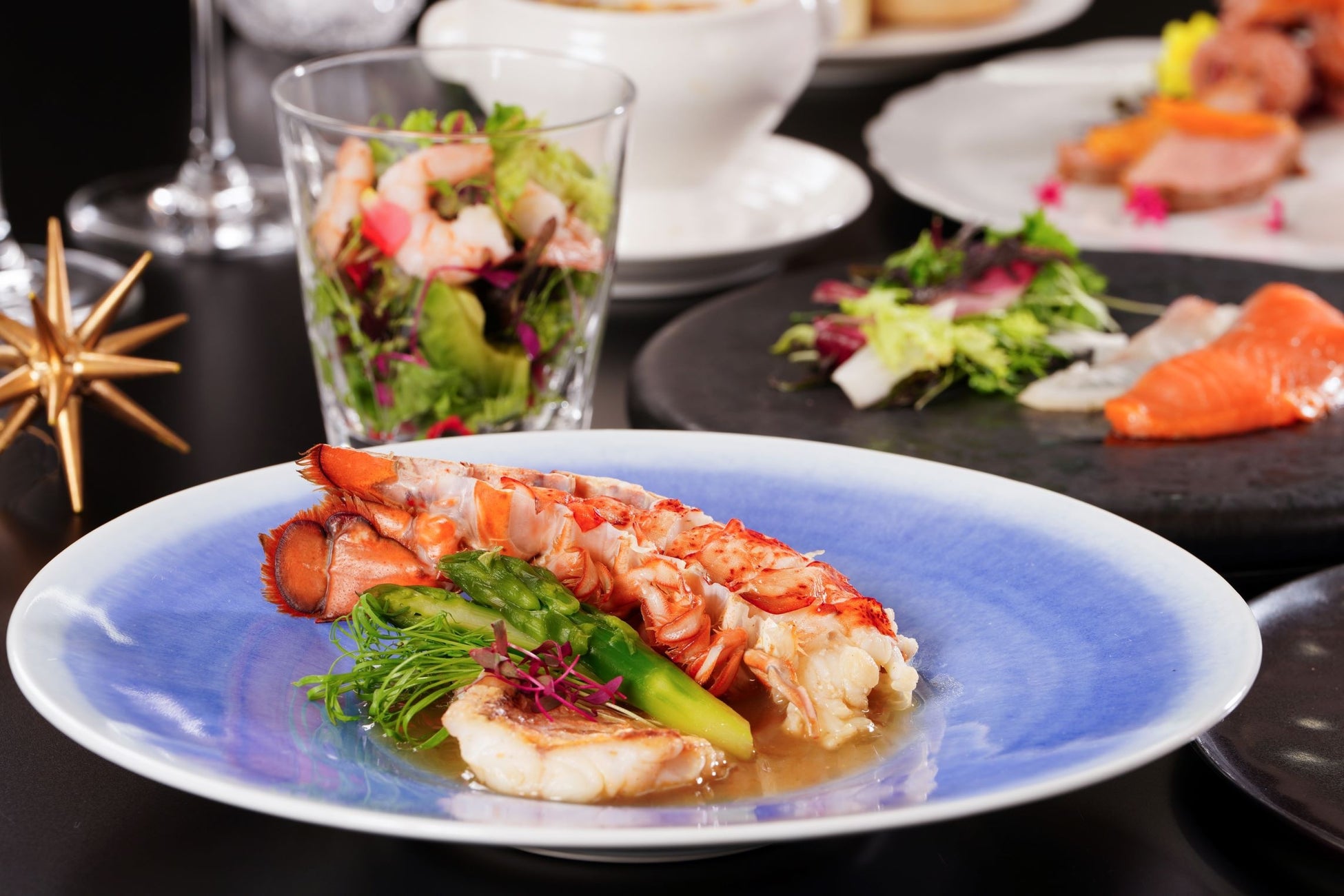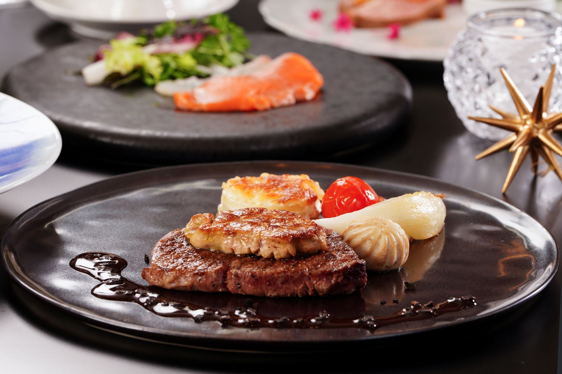 メインディッシュの「和牛ヒレ肉とフォアグラのソテー 赤ワイントリュフソース」は、シェフが丁寧に焼き上げる贅沢な一皿。牛ヒレを絶妙なやわらかさに焼き上げ、その上にフォアグラのソテーをのせた逸品です。トリュフ香る濃厚な赤ワインソースとご一緒にお楽しみください。魚料理の「甘鯛とオマールのナージュ仕立て」は、魚介の優しい旨味が口の中に広がります。甘鯛のふんわりとした身の甘みと、オマールの濃厚な味わいを、スープが引き立てます。また、ホテル初のデザートワゴンサービスは、シェフ特製のデザートをお客様のお席までお運びします。クリスマスを彩る華やかなデザートを、お好きなだけご堪能いただけます。
