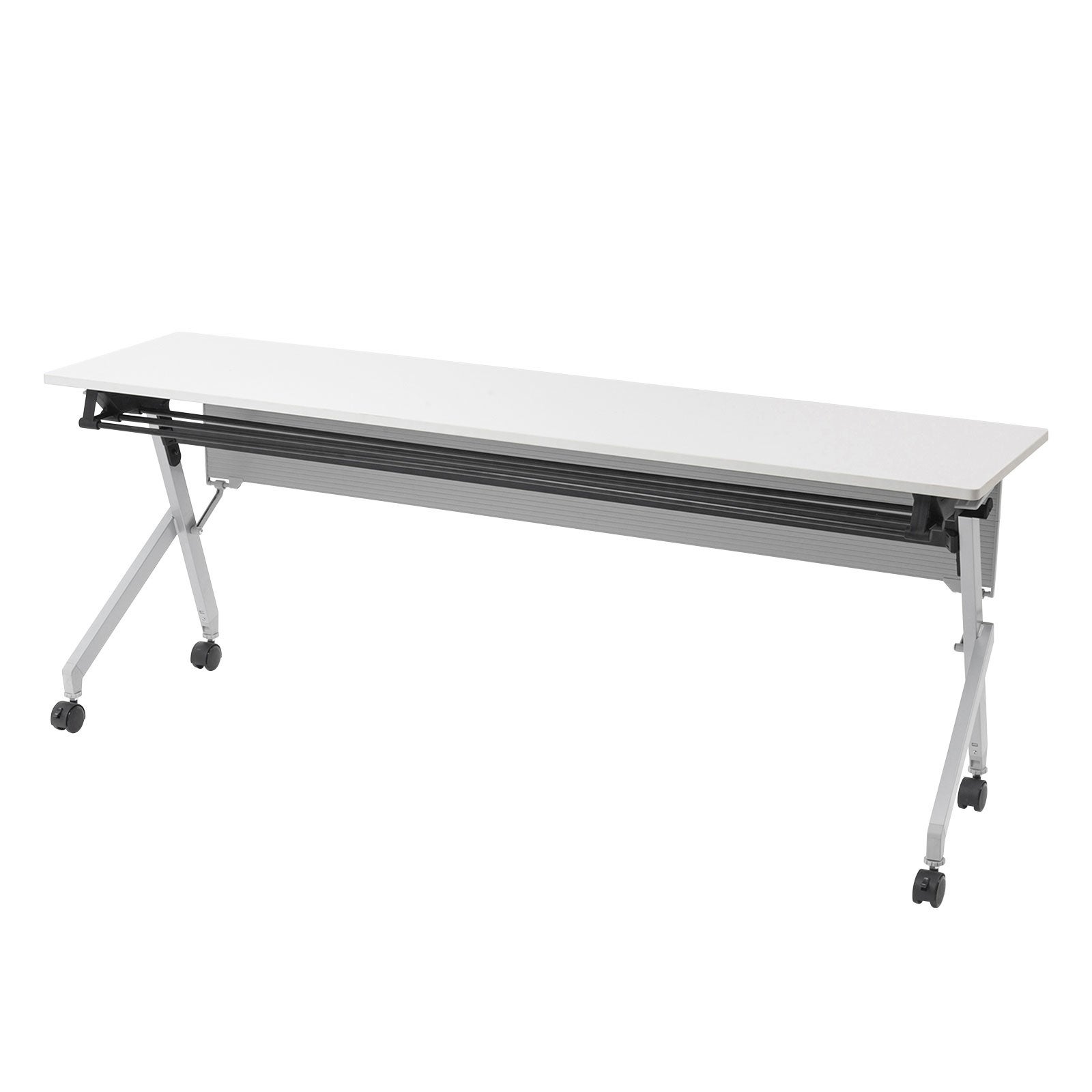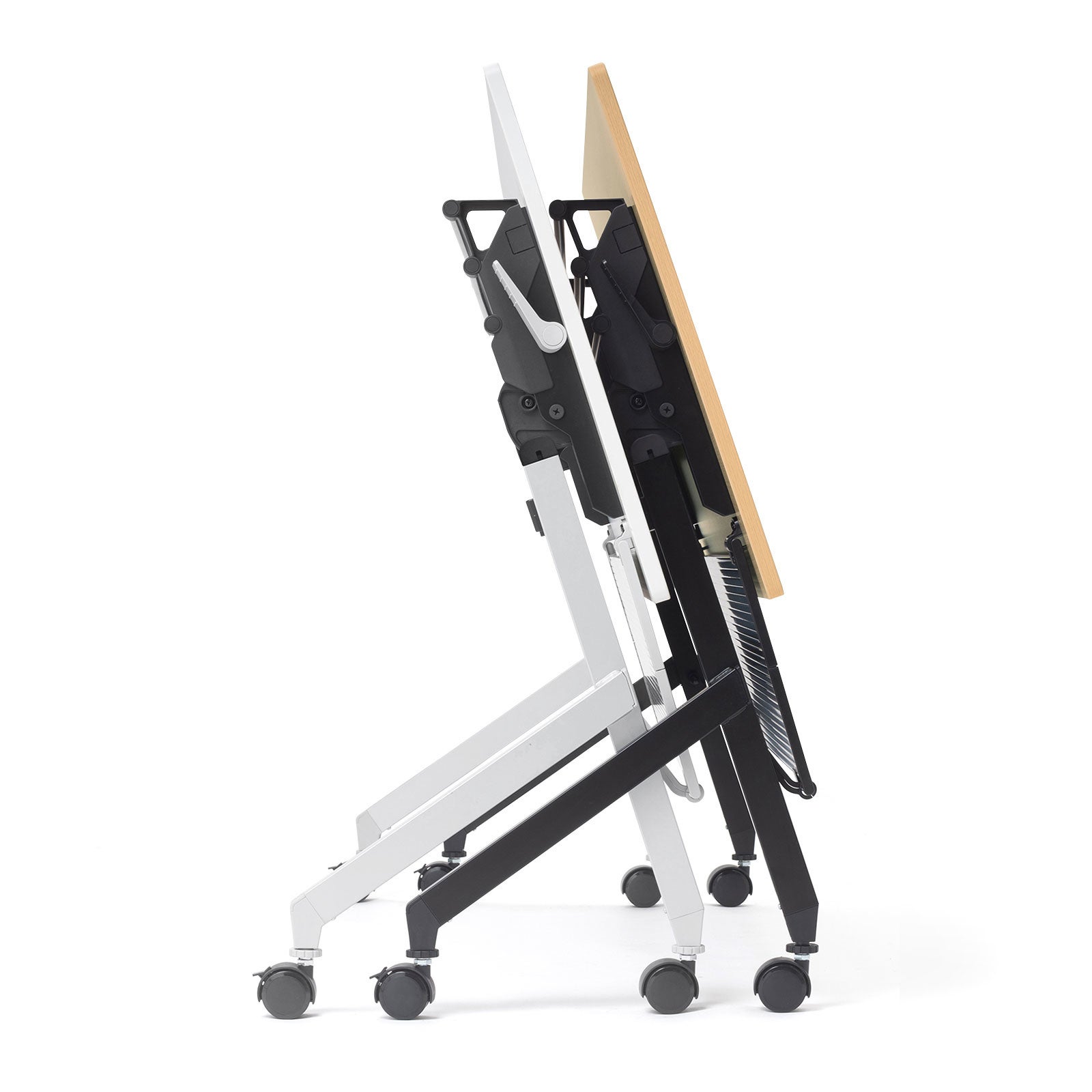 本シリーズは、使わないときに省スペースに収納できるフォールディングデスクです。平行スタッキングタイプで、レバーを引いてロックを解除するだけで複数台のデスクを重ねて収納できます。