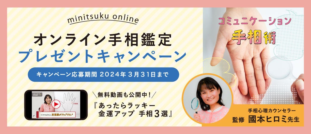 キャンペーン期間中に「【ミニツクオンライン版】笑顔のきっかけ コミュニケーション手相術」のお申し込みをした方の中から、抽選で5名さまに手相心理カウンセラー國本(くにもと)ヒロミ先生の「オンライン手相鑑定(しあわせ手相鑑定)1時間分」をプレゼント。無料ビデオ通話アプリZOOMを使い、オンラインの対話形式で國本先生が手相鑑定します。