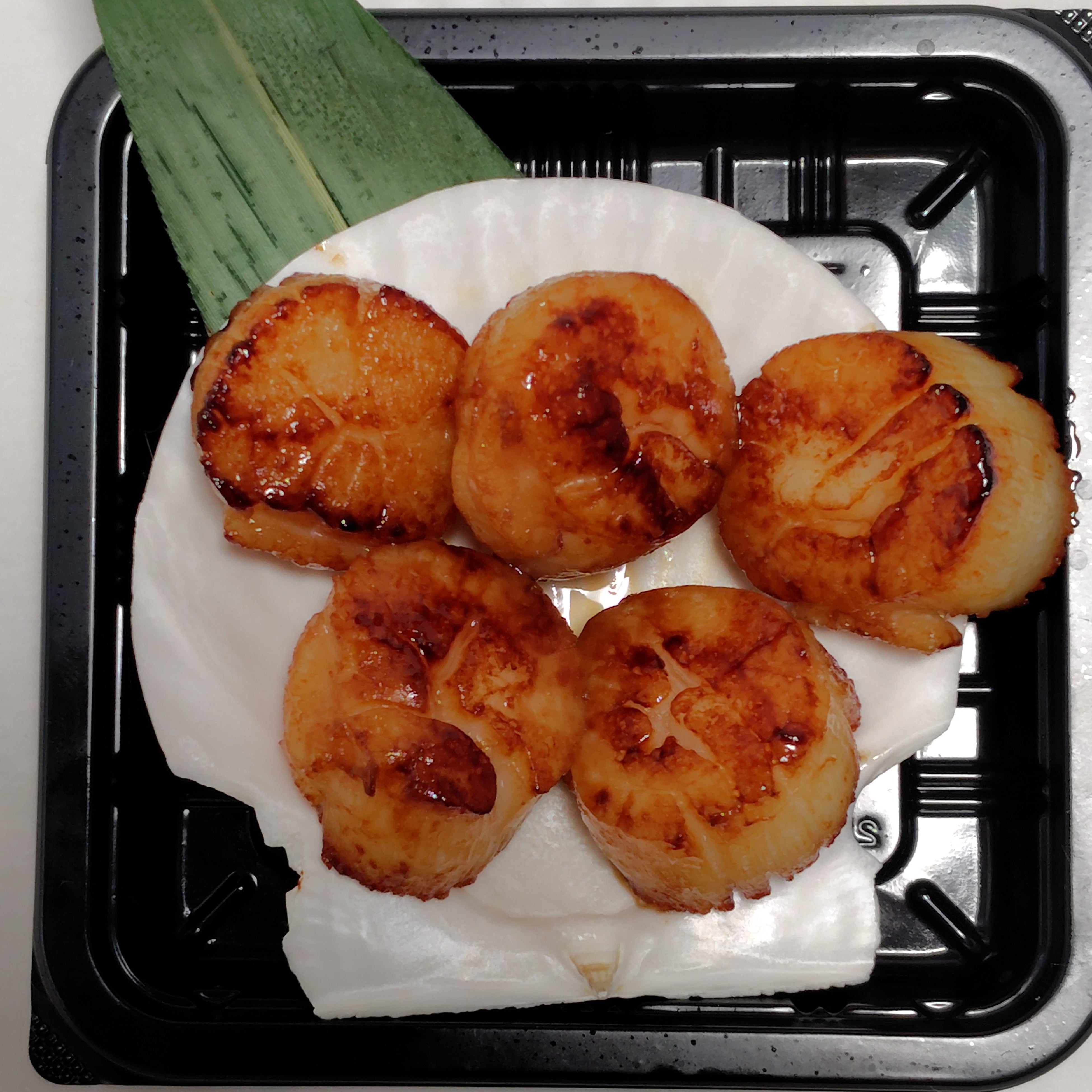 生でも食べられる宮城県産ほたて貝柱をオリーブオイル、バター・醤油で贅沢に焼き上げた一品を実演販売