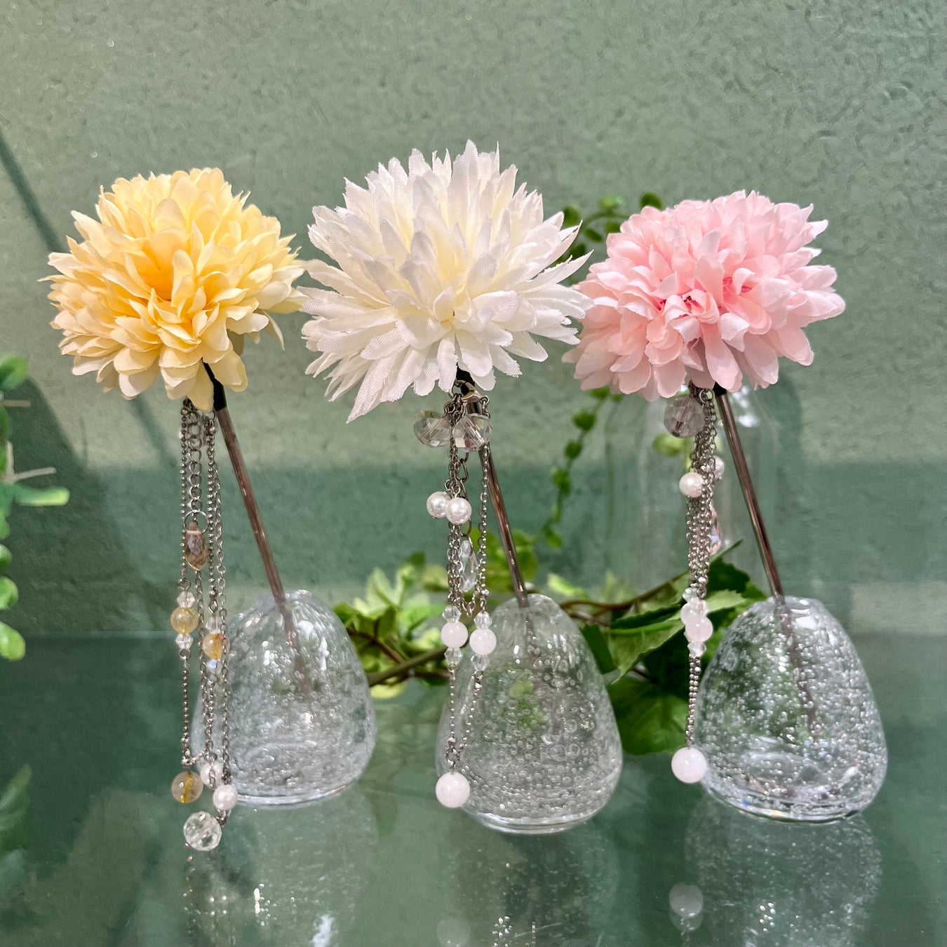 可愛らしいぽんぽんとした鞠菊から朝露のようなビーズがこぼれ落ちる一本簪です。