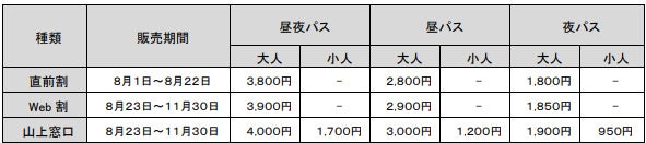 【料金】上記、夜パスまたは昼夜パスのとおり