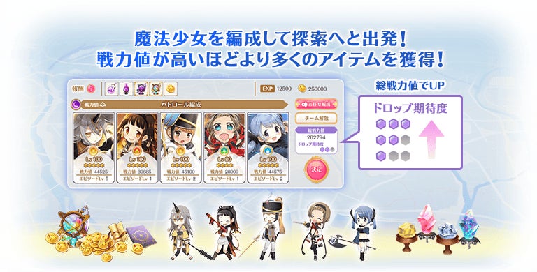 「総戦力値」が高くなるように、各属性の魔法少女を育成して、エリアを探索し報酬を獲得しましょう!