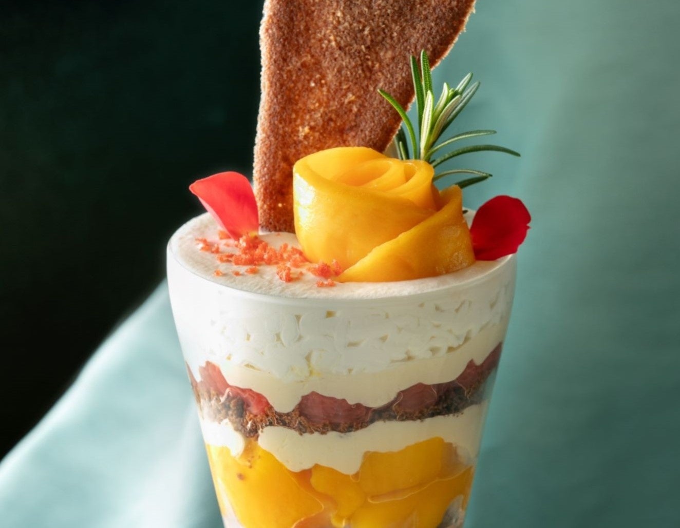 トップには薔薇に見立てた、とろけるような甘さのマンゴーとサクサクとした食感のスパイスチュイールをトッピングし、初夏の南国気分を表現。下層の濃厚なクレミアソフトクリームや生クリームとの相性は抜群です。