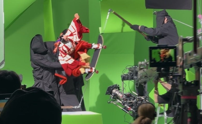 撮影はグリーンバックスタジオにて実施。吉田一輔さんたち3名の人形遣いが黒衣姿となり、スケートボードに乗った“陀羅助”をダイナミックに操っていただきました。