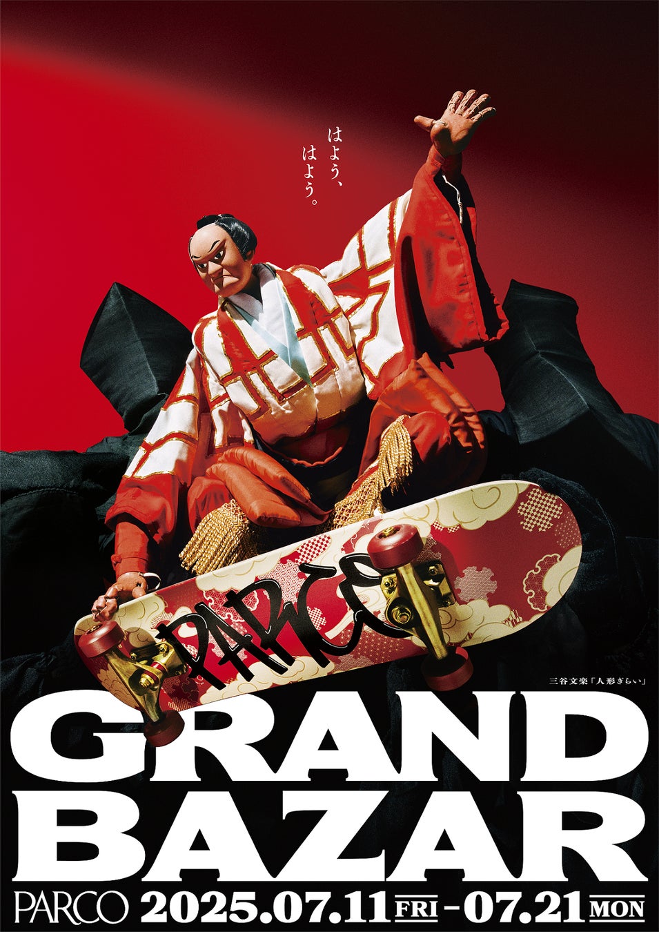 今年のグランバザールは、8月にPARCO劇場にて上演を控える、劇作家 三谷幸喜氏の新しい視点と演出で創作した超古典エンタテインメント“三谷文楽”の新作「人形ぎらい」とタイアップ。撮りおろしCMでは、実際に文楽の舞台で使用されてきた本物の文楽人形が登場。「人形ぎらい」の主人公で、万年憎まれ役の文楽人形“陀羅助(だらすけ)”がグランバザール特別バージョンのスニーカーを身に着け、スケボーで街中を駆け巡ります。