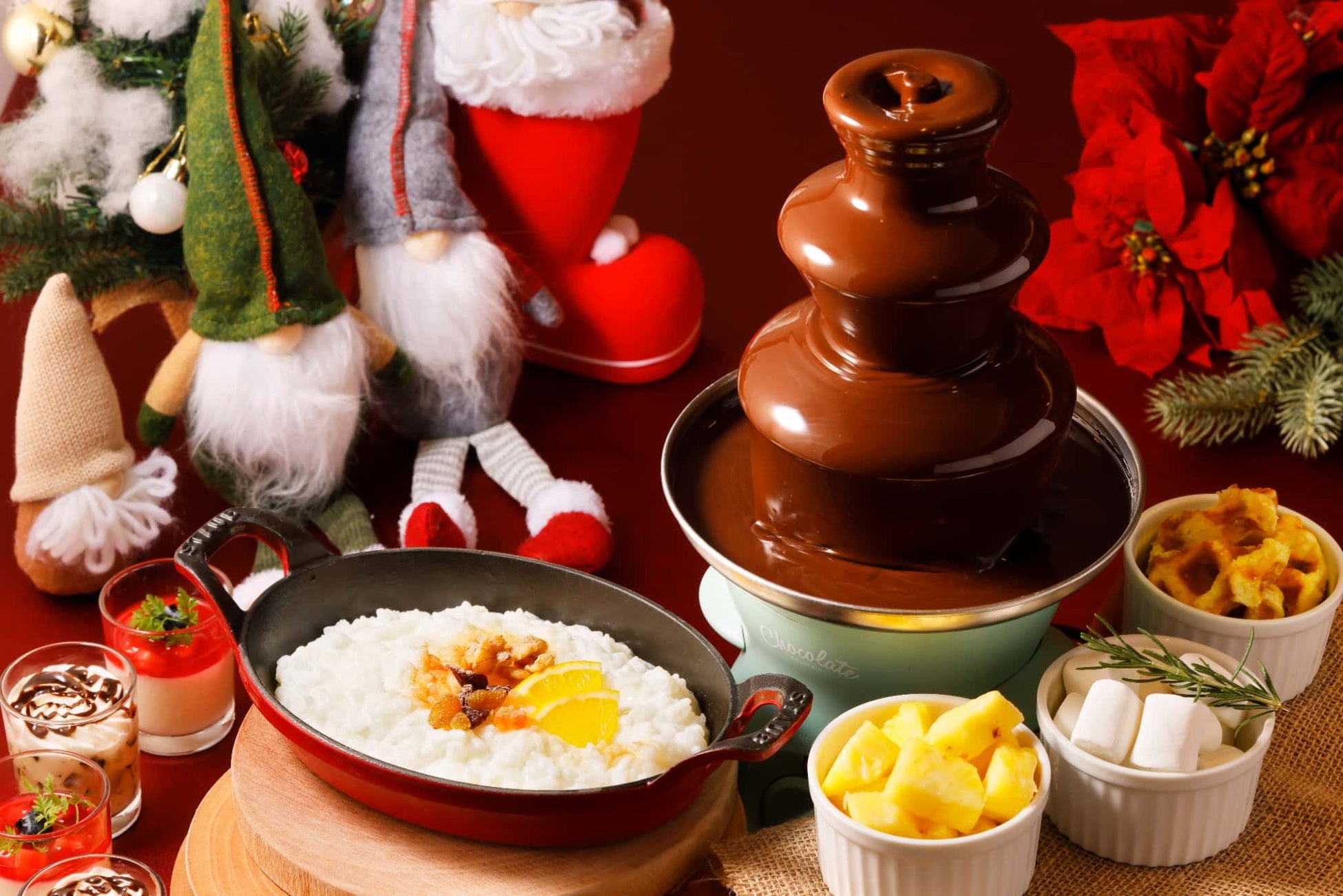 また、「フライドチキン」や「ナポリタンスパゲティー」「チョコレートフォンデュ」などお子さまに嬉しいメニューやソフトドリンクも多数ご提供。小学生以下のお子さまにはスタッフからささやかなクリスマスプレゼントを差し上げます。