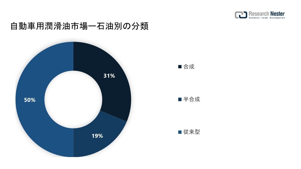 石油別に基づいて、従来型のセグメントは、予測期間の終わりまでに最大のセグメントシェアを保持することに起因しています。 従来型の石油は原油に由来するため、アクセスしやすいため、消費者にとって好ましい選択肢となります。 さらに、耐熱性や過酷な物理的条件に対する安定性などのさまざまな利点により、潤滑性を高め、エンジン保護を強化するための自動車用エンジン オイルの製造において優れた選択肢となります。