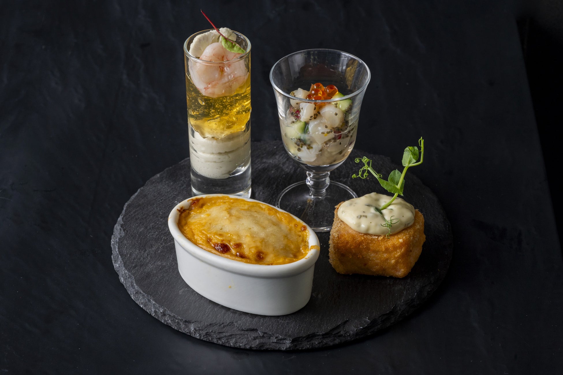 上段に位置するセイボリーの「帆立貝ととんぶりのサラダ」は聖夜に灯るクリスマスキャンドルに見立てました。プリっと身が引き締まったホタテと「畑のキャビア」との異名をもつ「とんぶり」を使用したサラダはプチプチとした食感が楽しめる一品となっております。