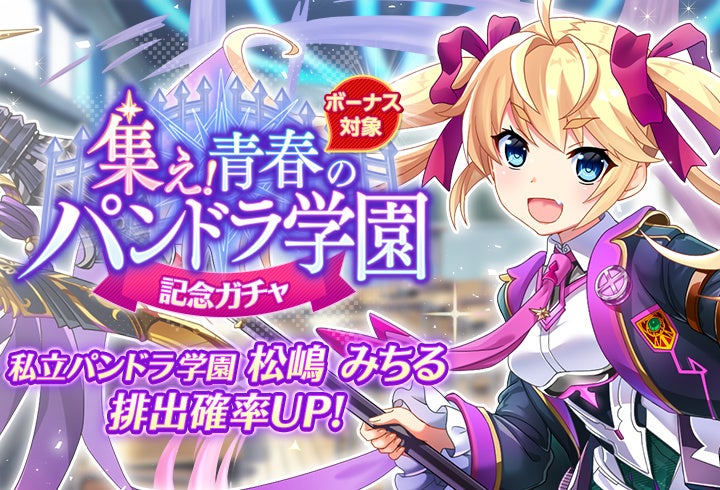 レイドイベント開催記念として、新たに[私立パンドラ学園]松嶋みちるが記念ピックアップガチャに登場! 「集え! 青春のパンドラ学園」のバトルに編成して挑むとイベントアイテム「青春のHB」の獲得量がアップします。イベントに有利な[私立パンドラ学園]松嶋みちるをゲットし、イベントに挑んでみてください。