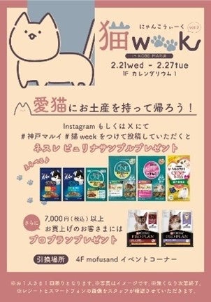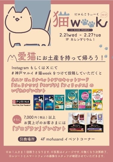 プレゼント配布条件:イベント会場1Fカレンダリウム1にてご購入いただいた商品を撮影し、#神戸マルイ#猫WEEKをつけてシェア!
