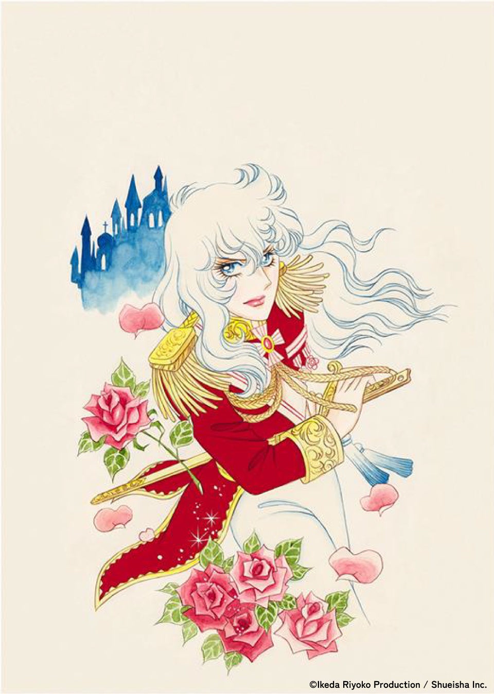 赤い薔薇が舞う中、深紅の衣装に身を包み、剣を抜こうとするオスカル。強いまなざしを向け、青く表現された髪を風になびかせています。直筆サイン入り。