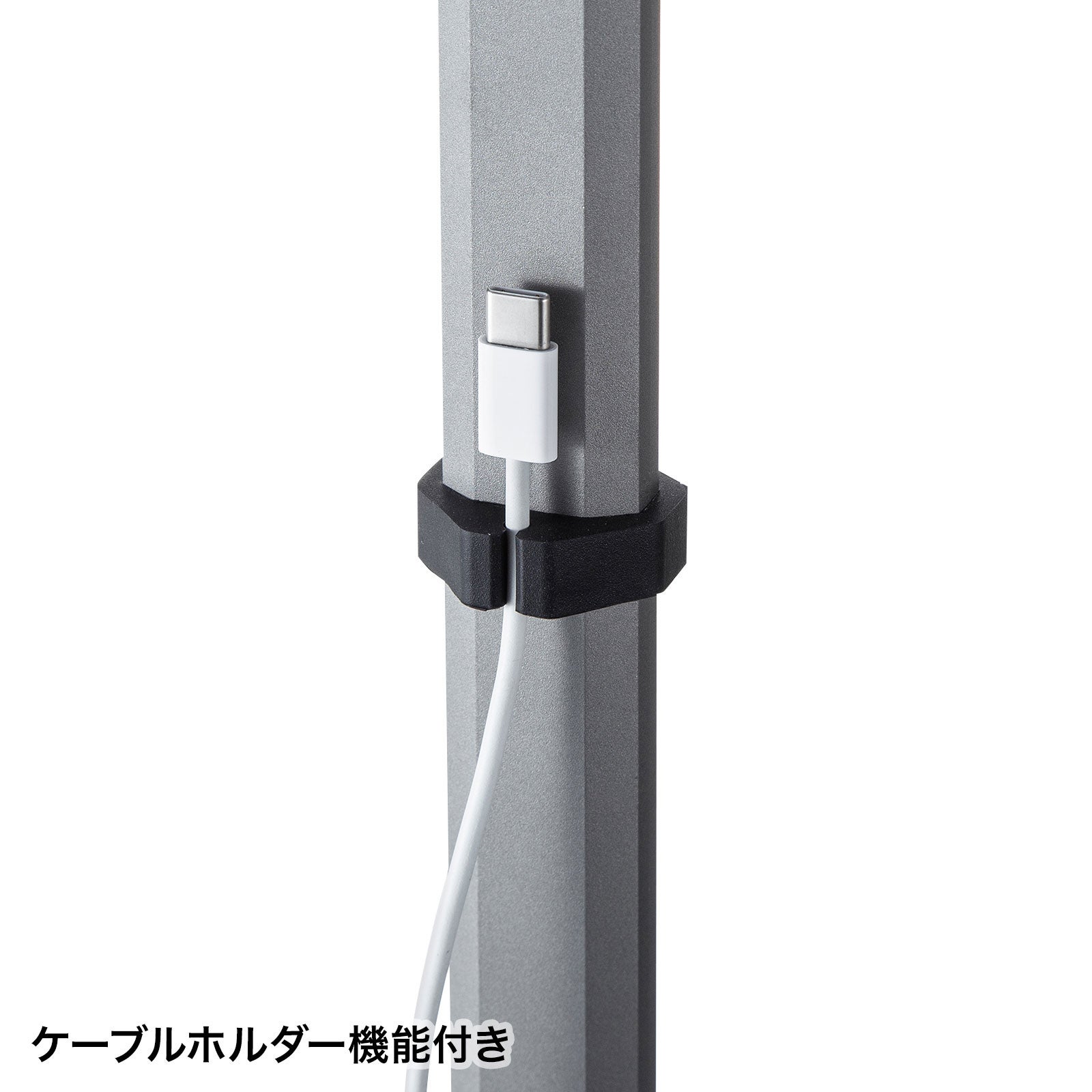 支柱には充電ケーブルを固定できるケーブルホルダーと、スタンド部分にはケーブルホールが付いているので、充電ケーブルをスタンド背面へスッキリ配線できます。