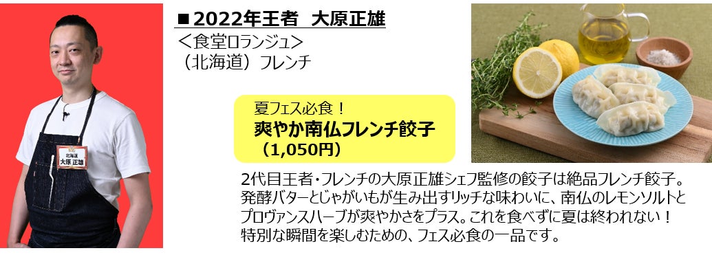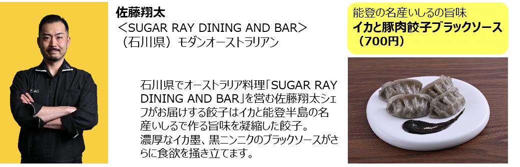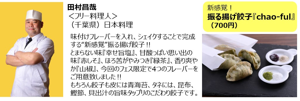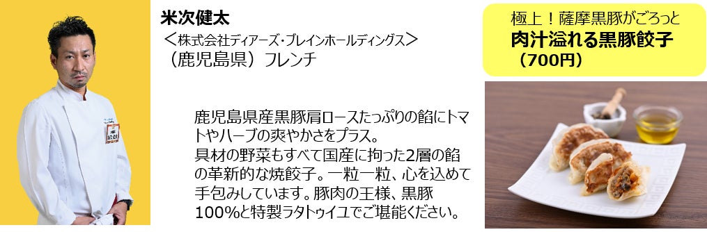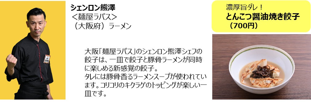 さらに、「あなたが選ぶ!餃子-1グランプリ」への出店9シェフの餃子メニューも決定しました。