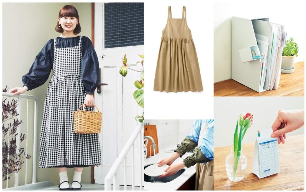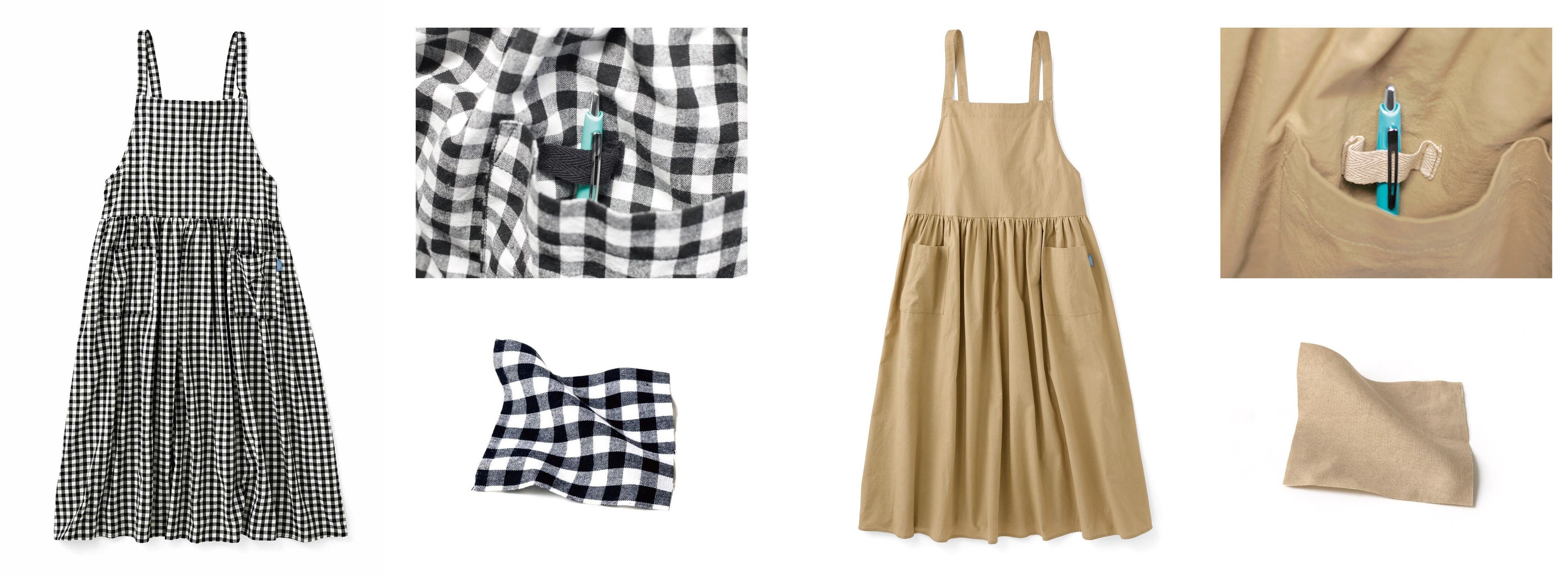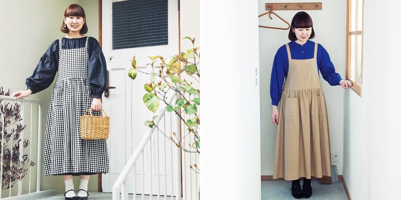 「おうちでは好きなものを着て機嫌よく過ごしたいのでワンピースを選ぶことが多い」というおさよさんがセレクトした、2種類のエプロン風ワンピース。デザインは、大人に似合う大きめの〈ギンガムチェック〉と、どんなコーデにも合わせやすい〈ミルクティーベージュ〉です。