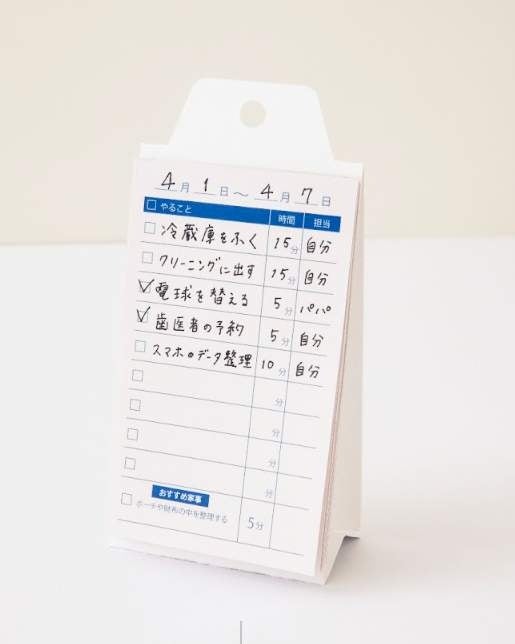 「今週やりたい家事」を書き留めておくスタンドメモは、タスク管理ではなくあえて「ウィッシュリスト」としているのがポイントです。手書きすることでスマホよりも集中できて効率的にこなせるようになっています。家事のおおよその所要時間や担当者まで記入できるので、自分のタイミングで実践しやすく、家族と家事が分担できるのも魅力のひとつです。完了したら、チェックすることで達成感を味わうと同時に、自己肯定感を高めることができます。スタンドメモ1冊で1ヵ月分の家事を管理。自己流家事での見落としを防ぐ、おさよさんのおすすめ家事も掲載されています。