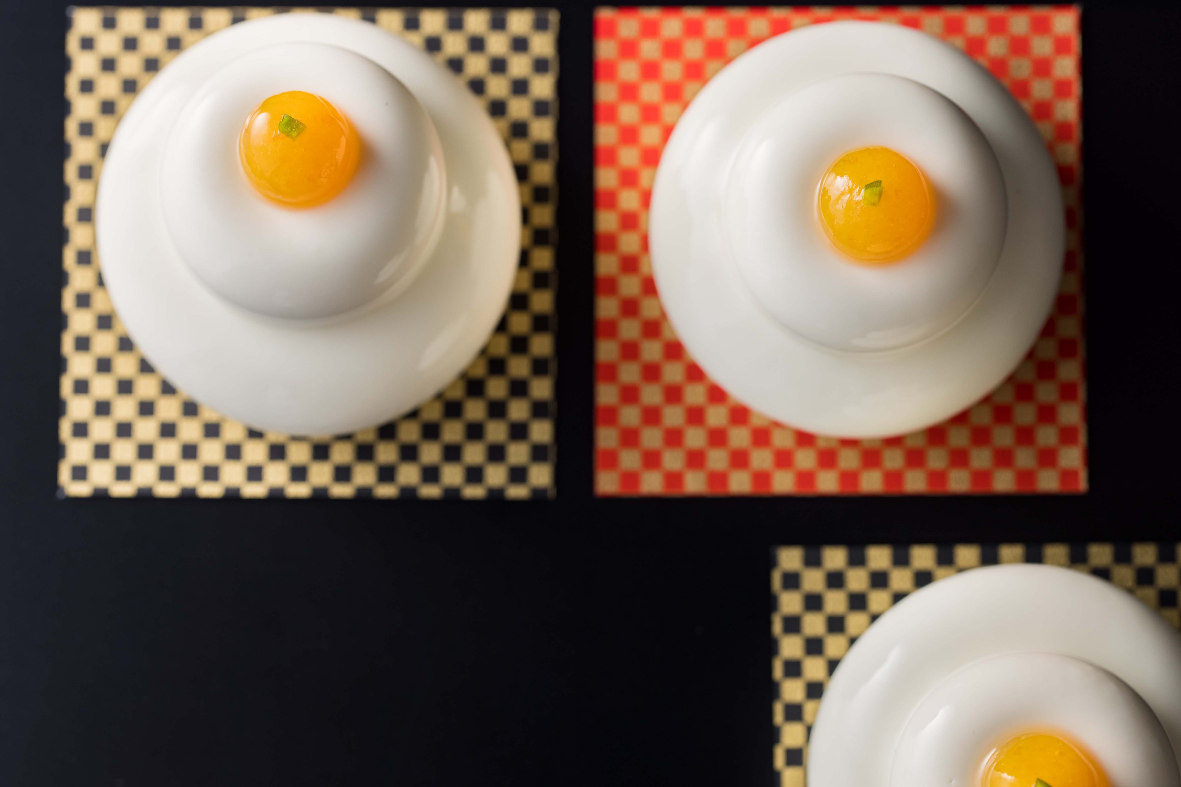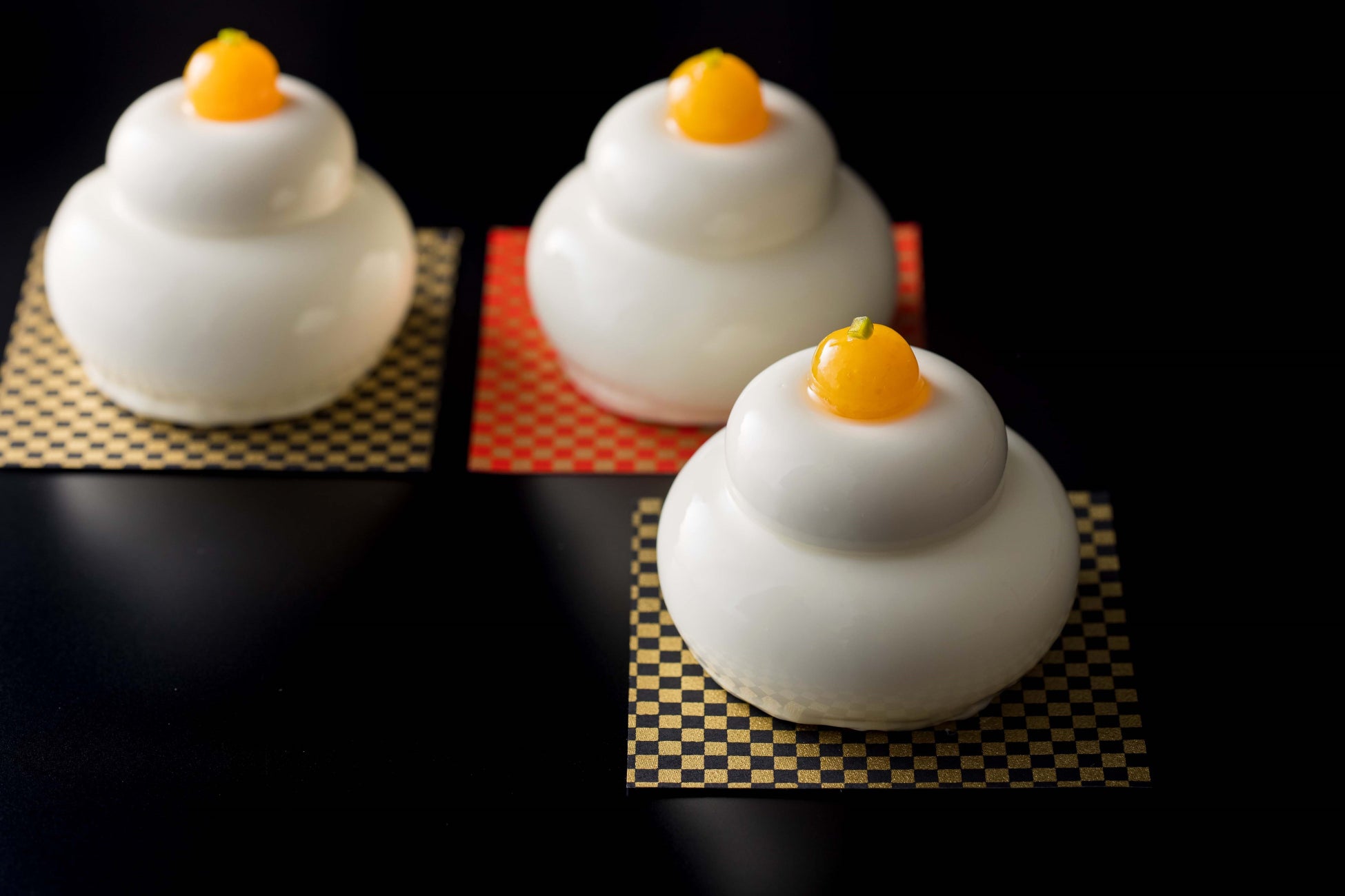 正月飾りを愛らしく表現した心華やぐスイーツ。和三盆糖を使用したスポンジ生地に柚子風味の餅と抹茶のガナッシュを重ね、甘酒ムースで包みました。ホワイトチョコレートのグラサージュを施し、橙に見立てた金柑のコンフィチュールをトッピングして仕上げた、目と舌で和を感じる新春スイーツです。