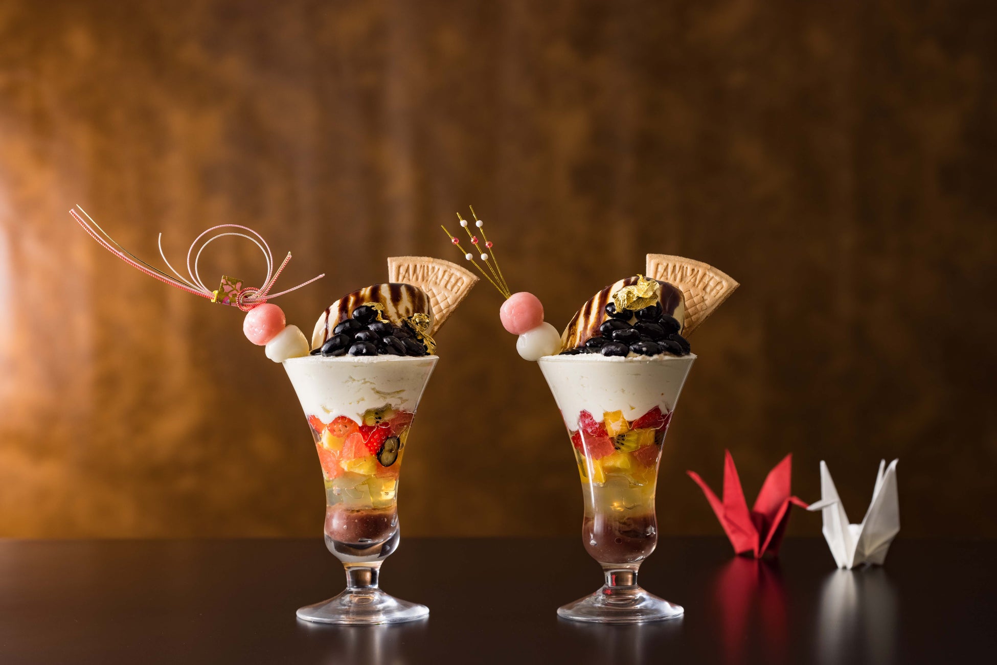 トップに紅白の白玉と新春を祝う水引を飾りつけた、新年の寿ぎにふさわしい華やかなパフェ。あんみつをイメージし、グラスには小倉あんや寒天、フルーツ、甘さ控えめの生クリームをたっぷり重ね、デコレーションに黒豆や黒蜜をあしらいました。和と洋が織りなすバランスの妙をお楽しみください。