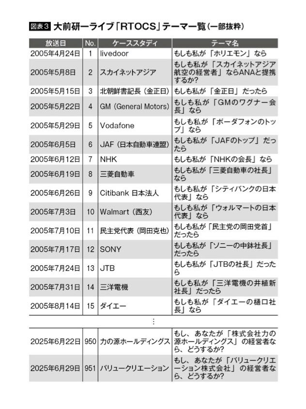 「RTOCS」は、テーマが無限にある。ビジネスに限らず、政治や経済や社会的な課題についても「もし私が○○だったら?」と問うことができる。そういう多様なトレーニングを繰り返していくことで「思考力」が磨かれていくのだ。本書でその要諦をつかみ、今後のビジネスに活かしてもらえれば幸いである。 大前研一