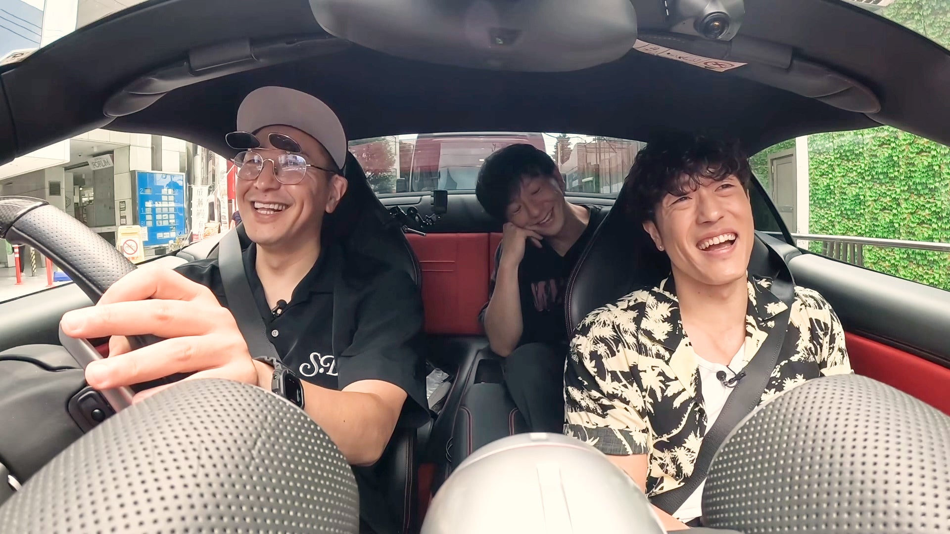 3人はフェラーリで都内をドライブすることに! 車内がコンパクトなため、後部座席の向井が顔を出そうと、とんでもない姿勢になって……。