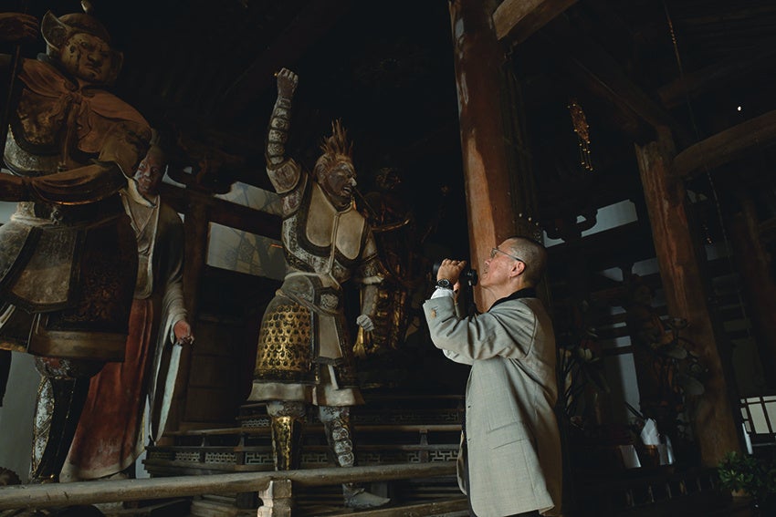 東大寺法華堂の諸尊を双眼鏡で鑑賞する三好和義さん。群像の雰囲気とともに細部の文様と彩色の妙を味わう。