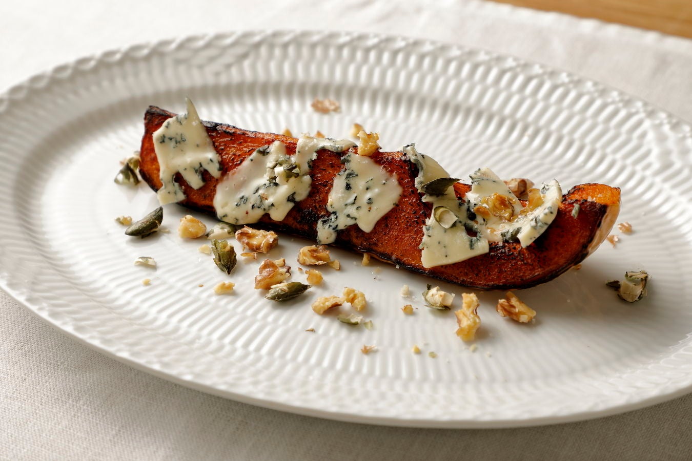 きたまちのフレンチレストラン「ラ・トラース」(奈良県奈良市)で前菜として出される「バターナッツカボチャのロースト」。ブルーチーズやナッツの風味が際立つ。奈良の生産者との交流から生まれる、素材重視の自然派フレンチならではの一品。