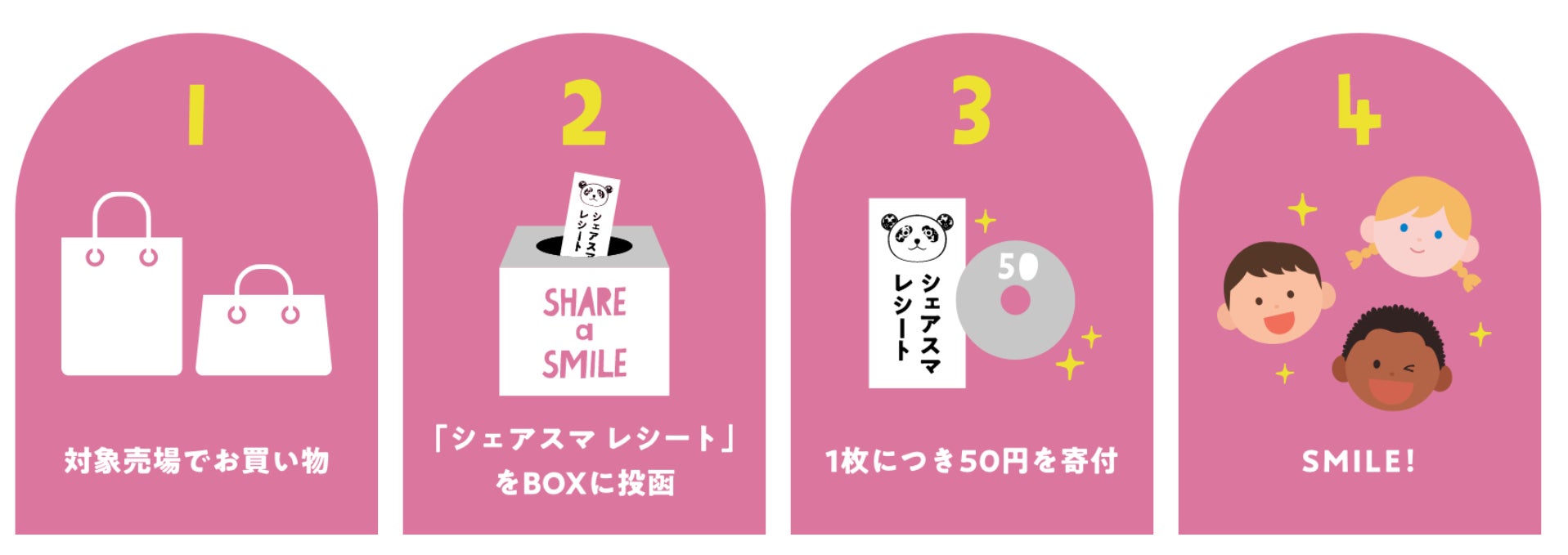 「シェアスマ レシート」チャリティーは、「SHARE a SMILE(お買物で笑顔をシェアしよう!)」の願いを込め、地域のこどもたちの笑顔につながることを目指すレシート寄付活動です。期間中、対象売場にてお買いあげごとに1枚お渡しする「シェアスマ レシート」をシェアスマBOXにご投函いただくことで、1枚につき寄付金50円を大丸松坂屋百貨店から地域のこども支援施設・団体へお届けします。