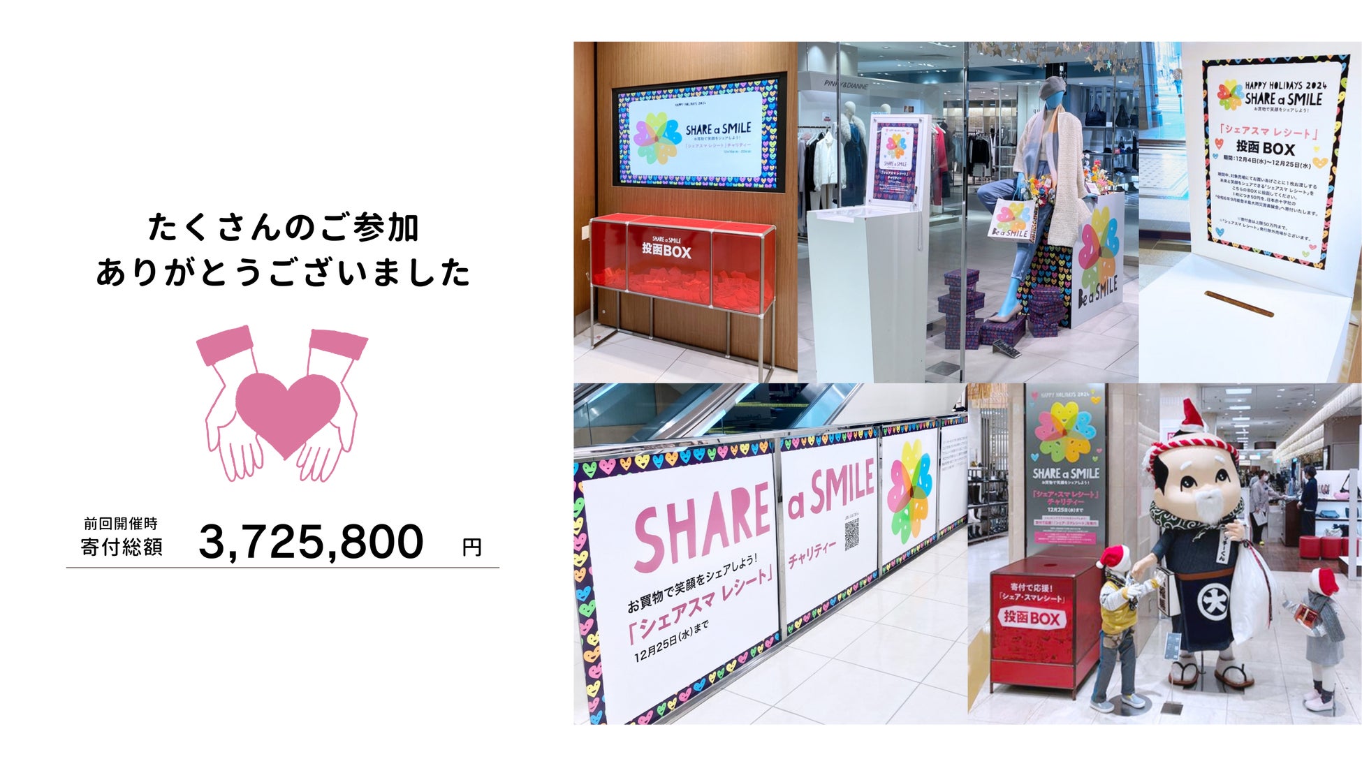 大丸京都店で2021年から継続開催の「シェアスマ レシート」チャリティーを2024年より全国9店舗に拡大して開催しました。前回のHAPPY HOLIDAYS 2024「シェアスマ レシート」チャリティーでは、お客様のたくさんのご参加により、総額3,725,800円を大丸松坂屋百貨店から寄付先へ寄付いたしました。
