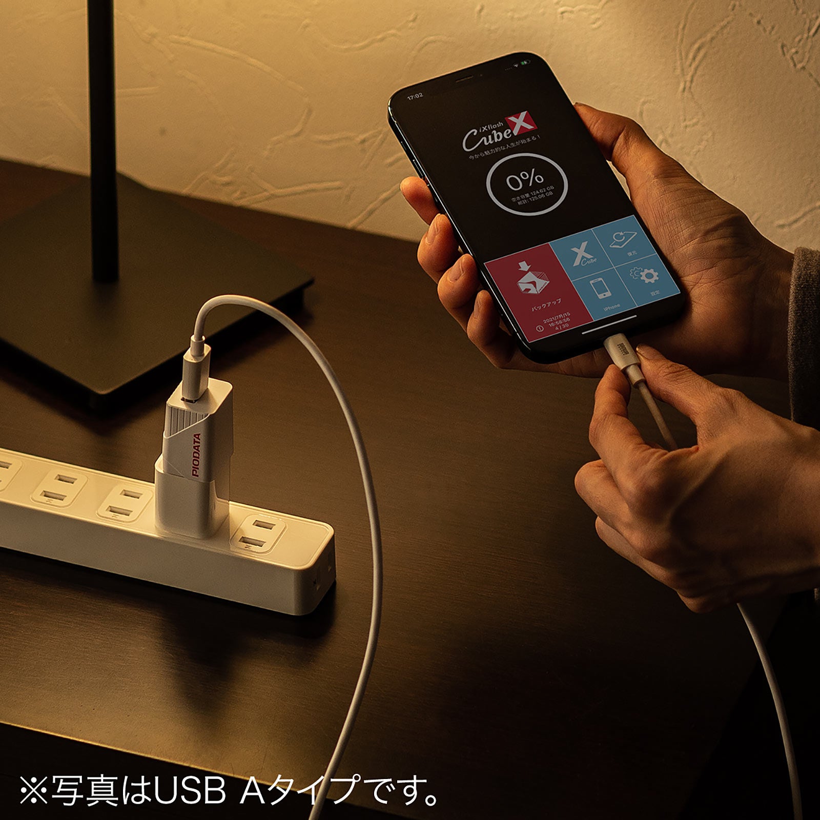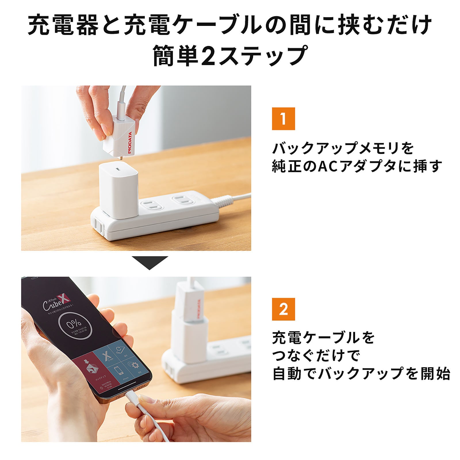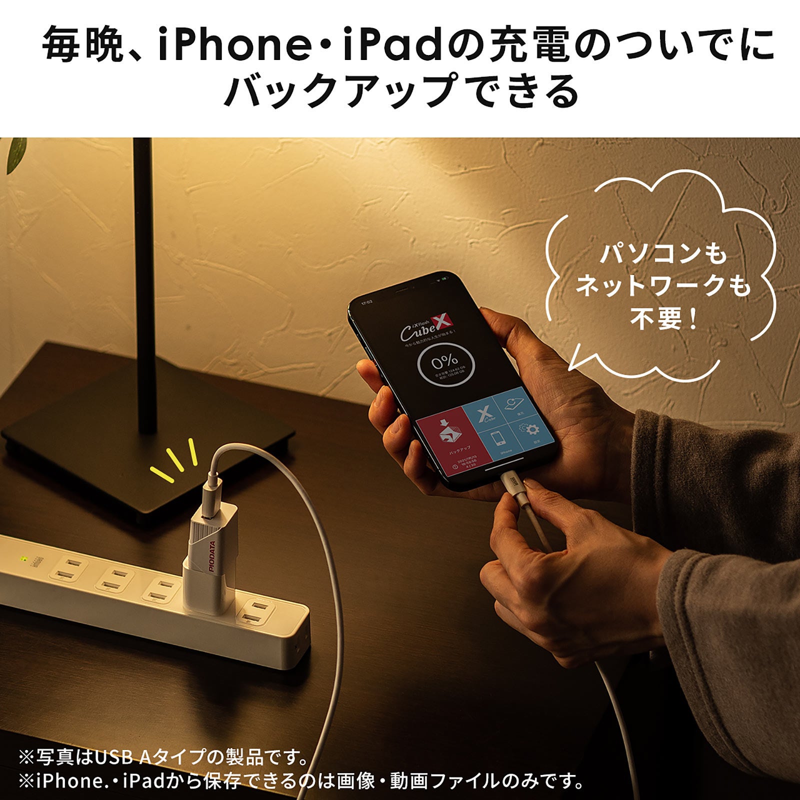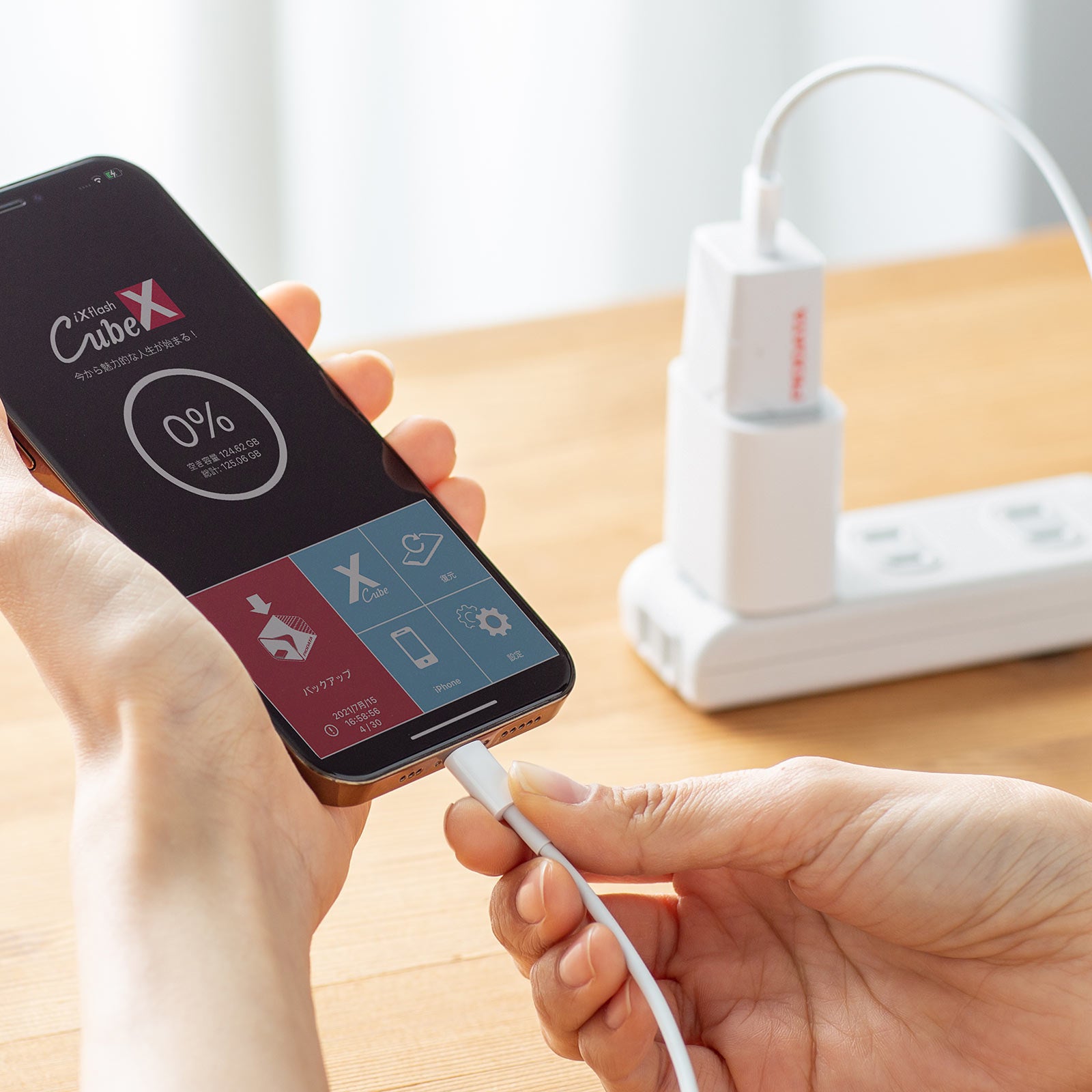 本製品は、Apple純正ACアダプタに本製品とiPhone/iPadをケーブルで接続し、専用アプリ「iXFlashCubeX」を使用することで、接続するたびに自動でデータをバックアップできます。Type-C - Lightningケーブルもしくは、Type-C - Type-CケーブルとUSB Power Delivery(PD)に対応したiPhone/iPadを使えば、高速充電が可能です。