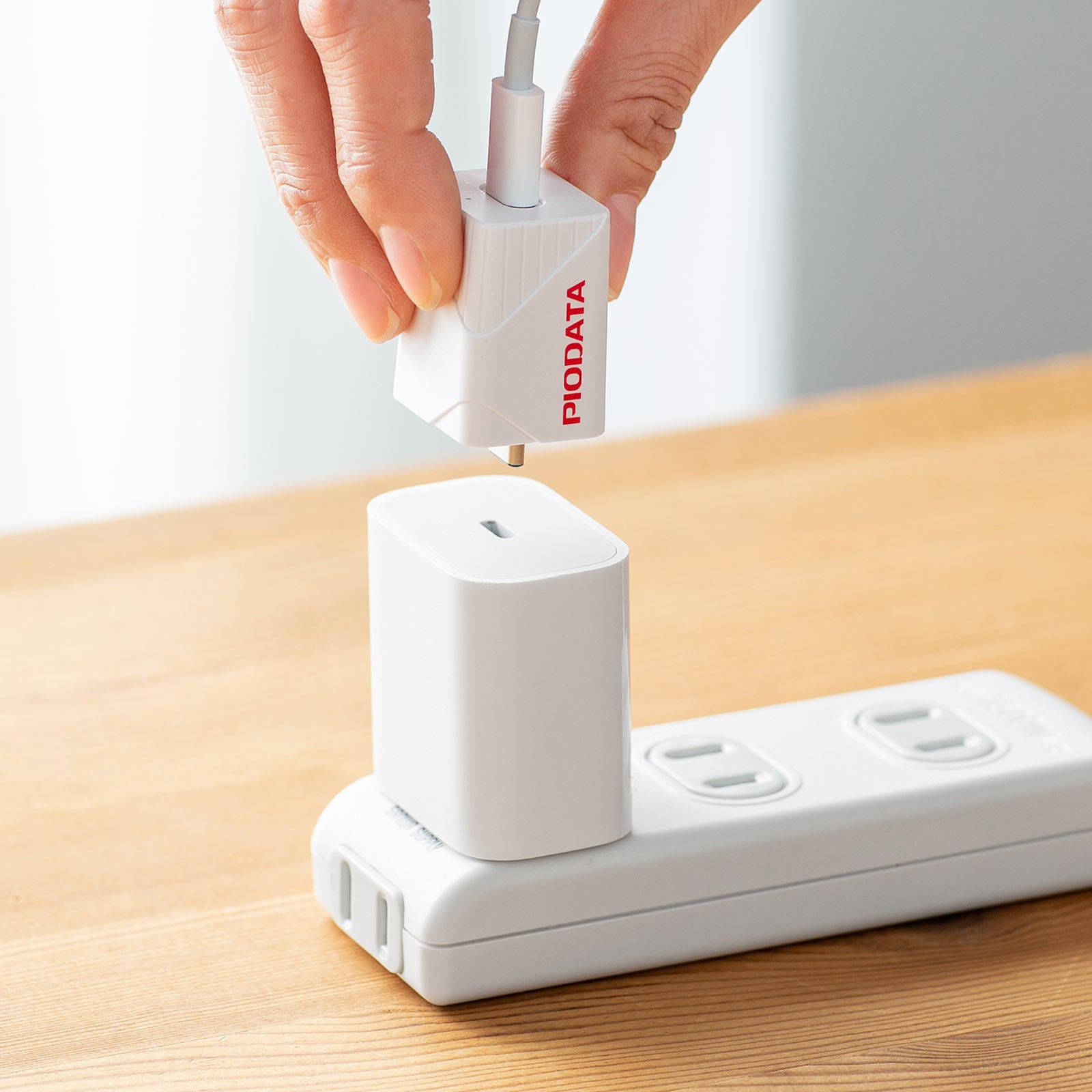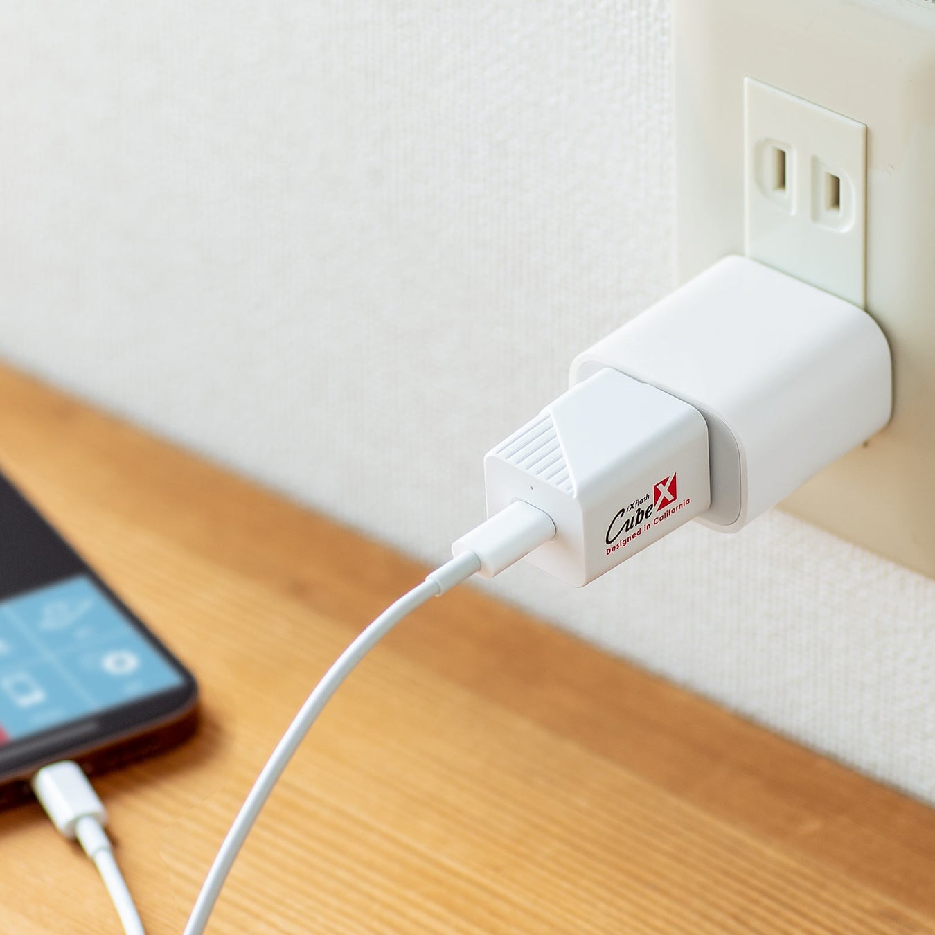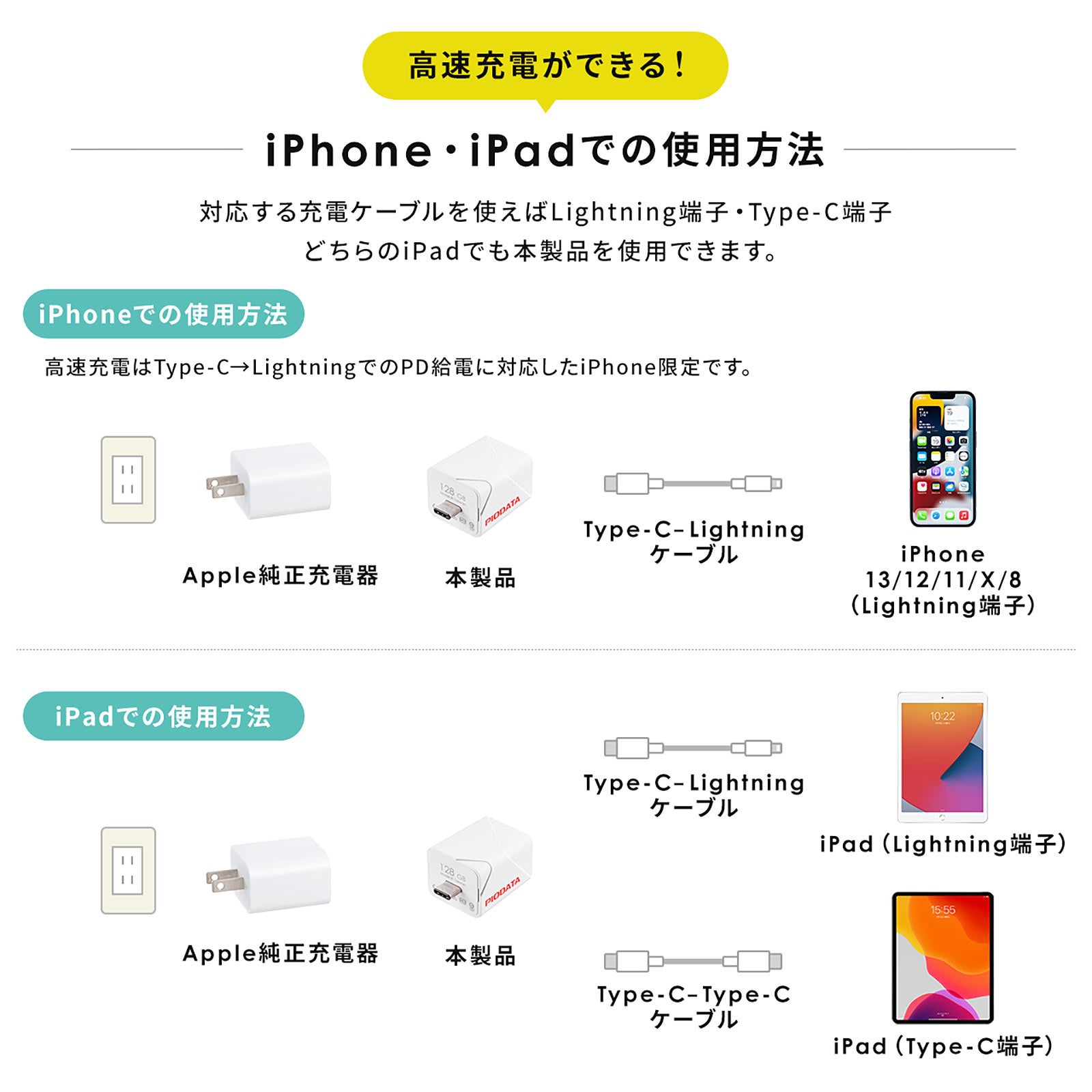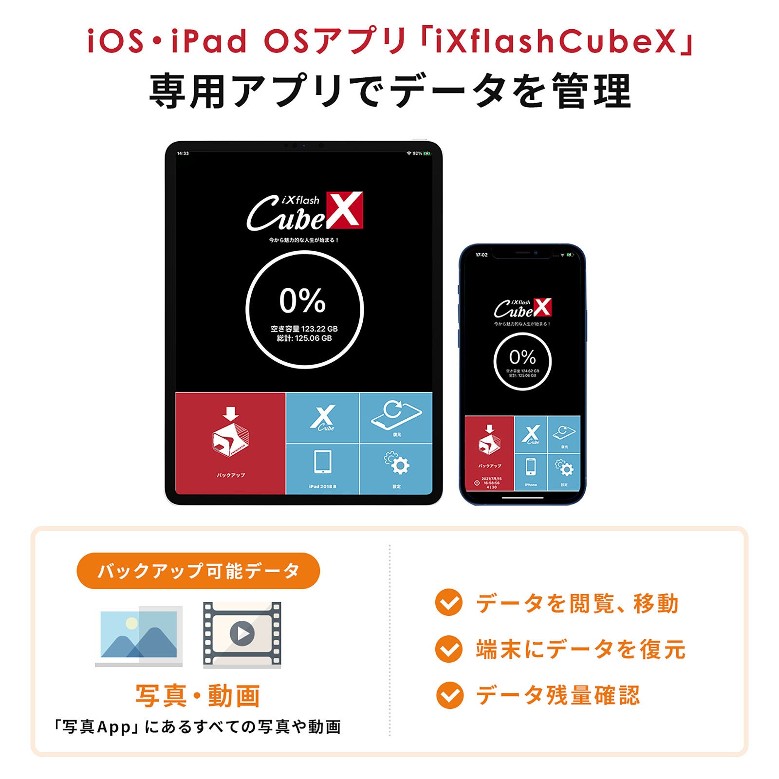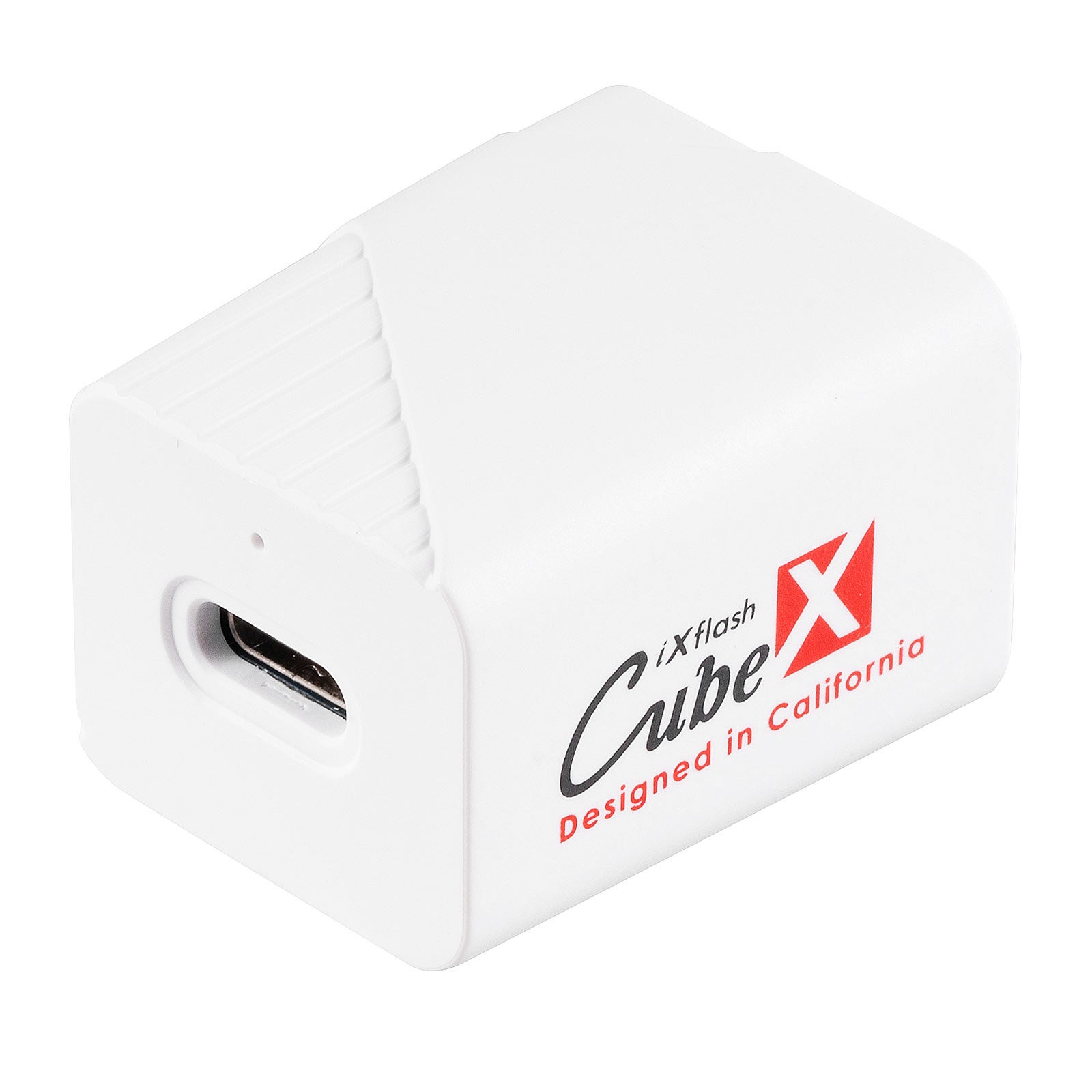 本製品は、Apple純正ACアダプタに本製品とiPhone/iPadをケーブルで接続し、専用アプリ「iXFlashCubeX」を使用することで、接続するたびに自動でデータをバックアップできます。Type-C - Lightningケーブルもしくは、Type-C - Type-CケーブルとUSB Power Delivery(PD)に対応したiPhone/iPadを使えば、高速充電が可能です。
