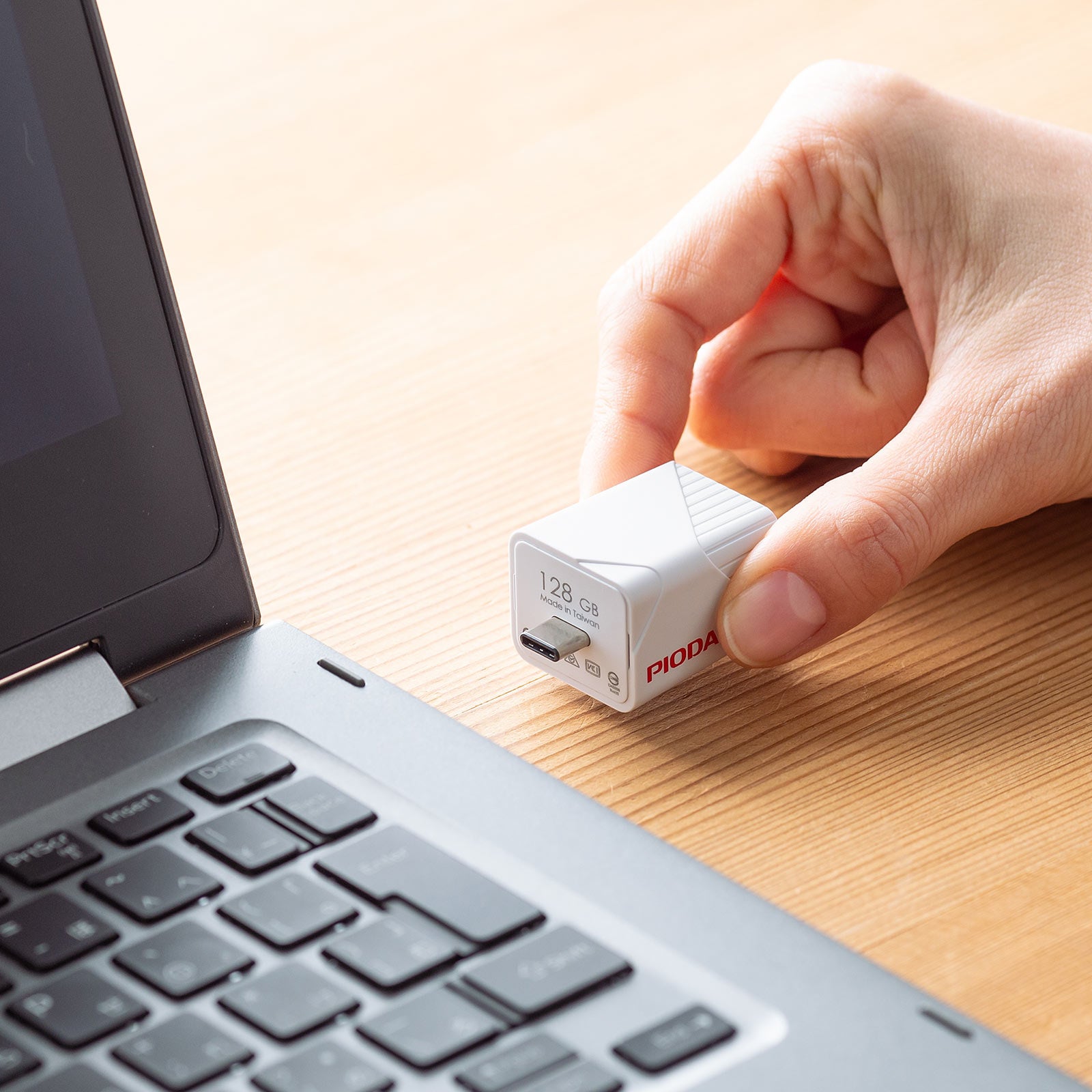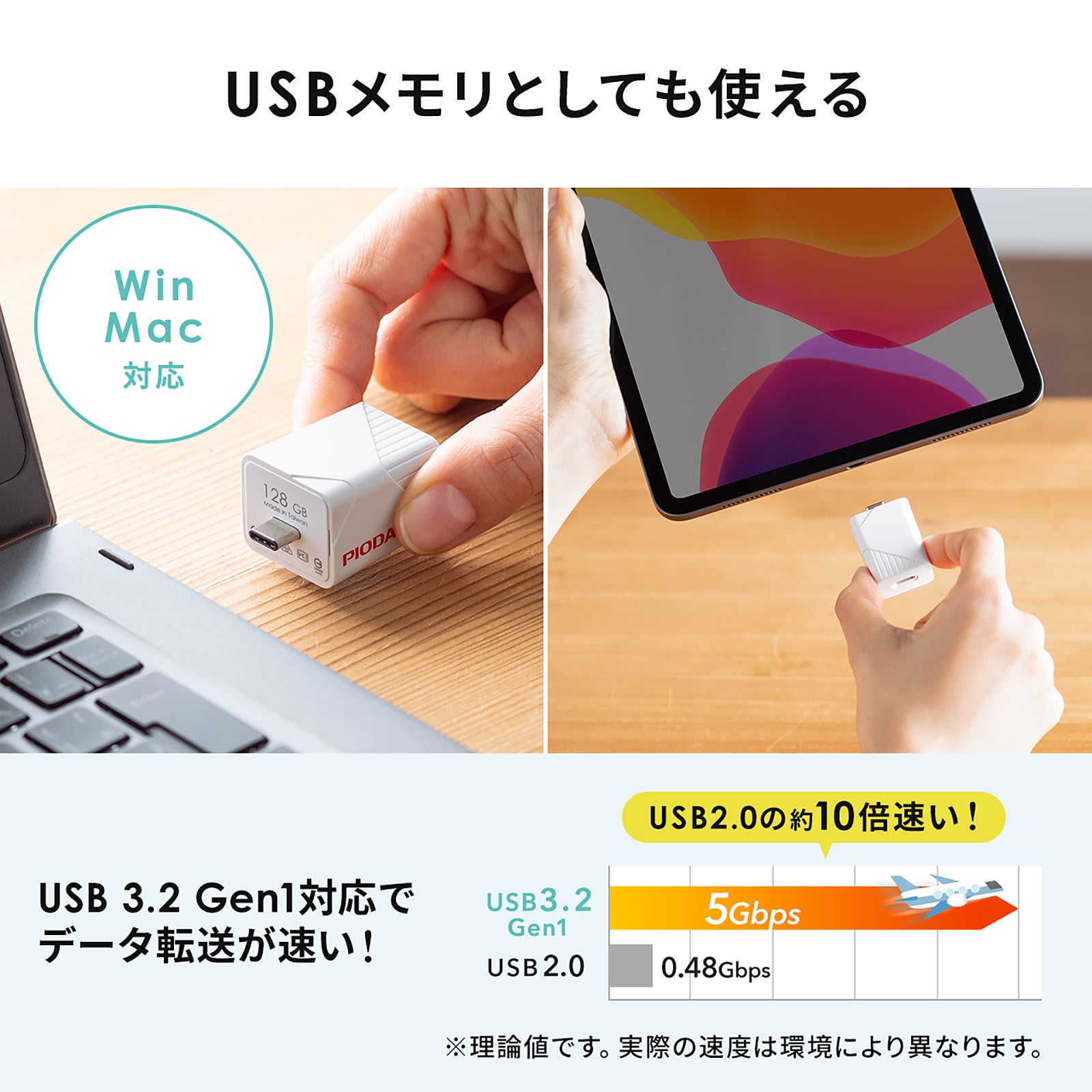 Type-Cポートを搭載したパソコンやiPadと接続すれば、USBメモリとしても使用することができます。USB3.2 Gen1対応で、高速データ転送が可能です。