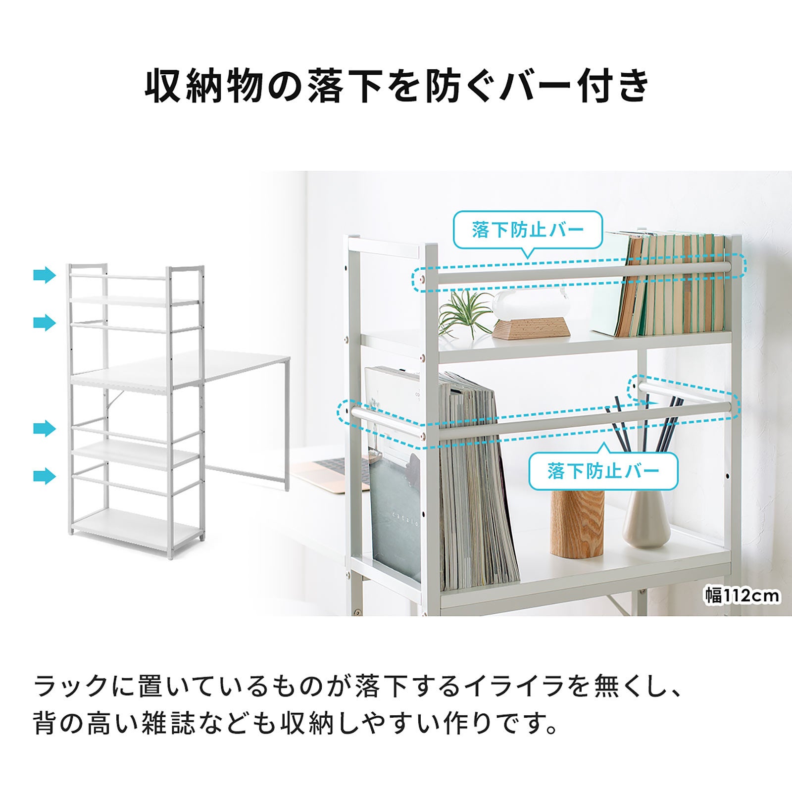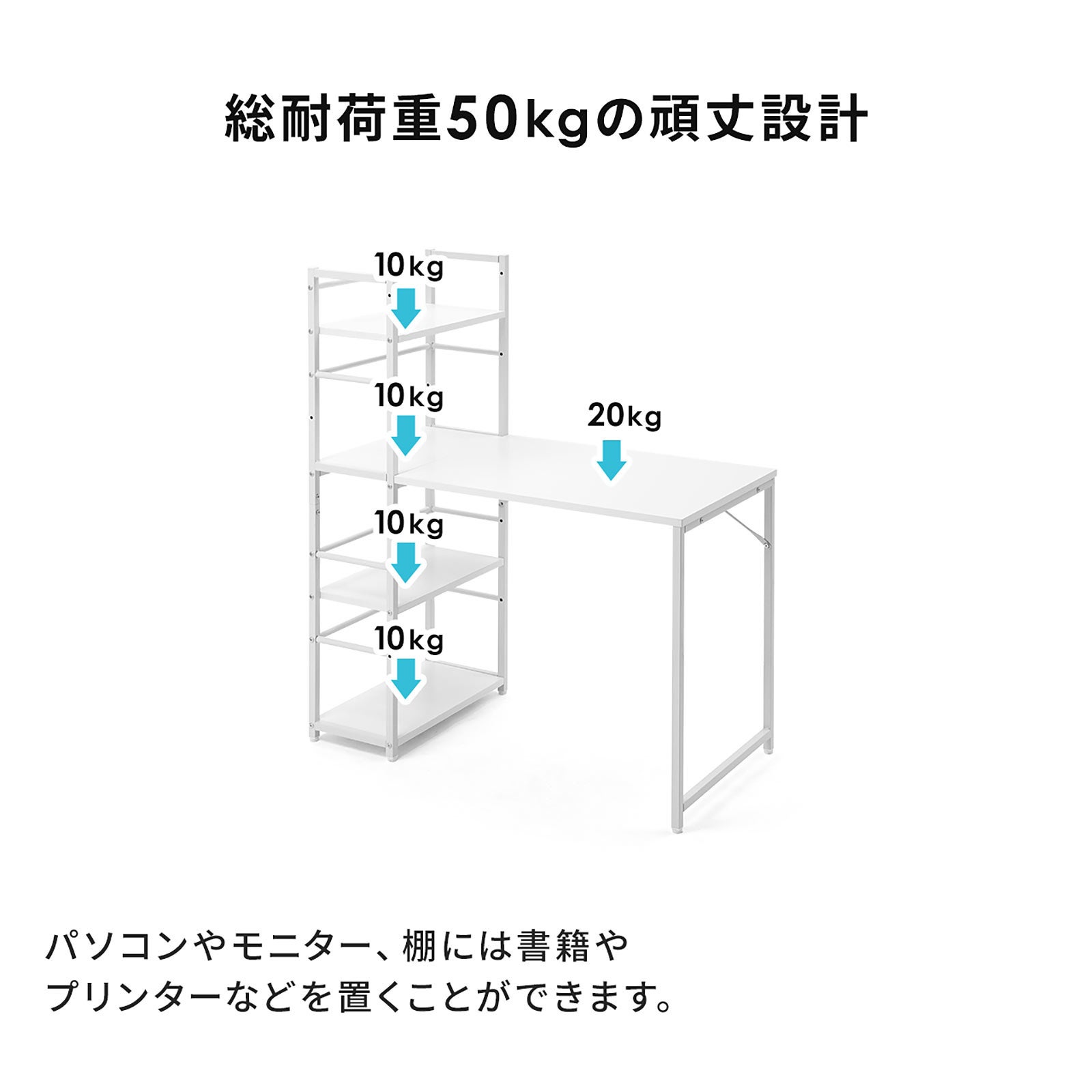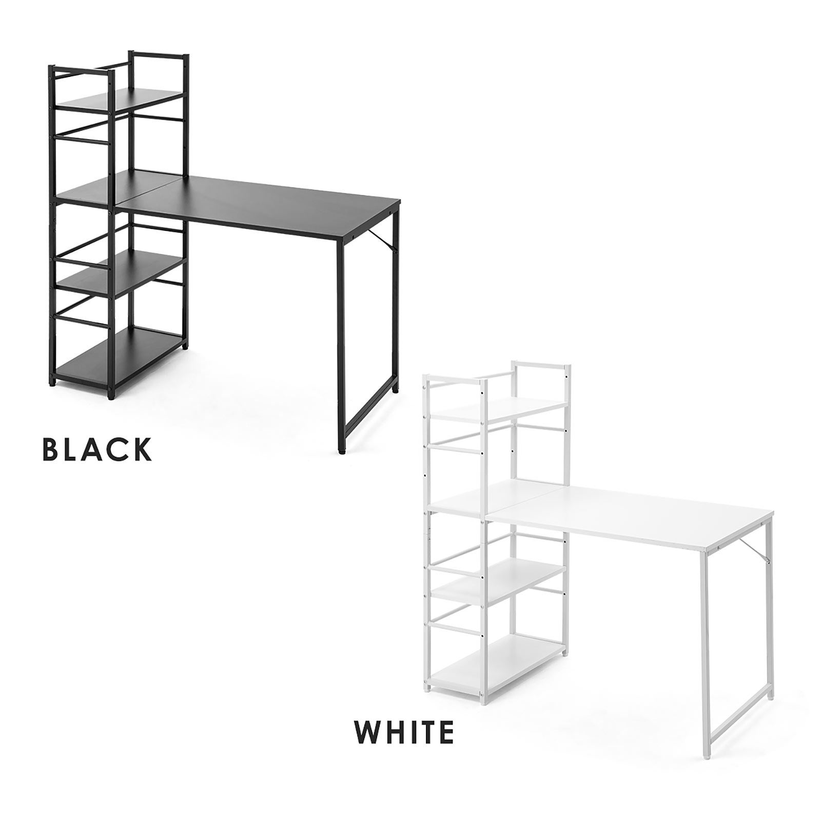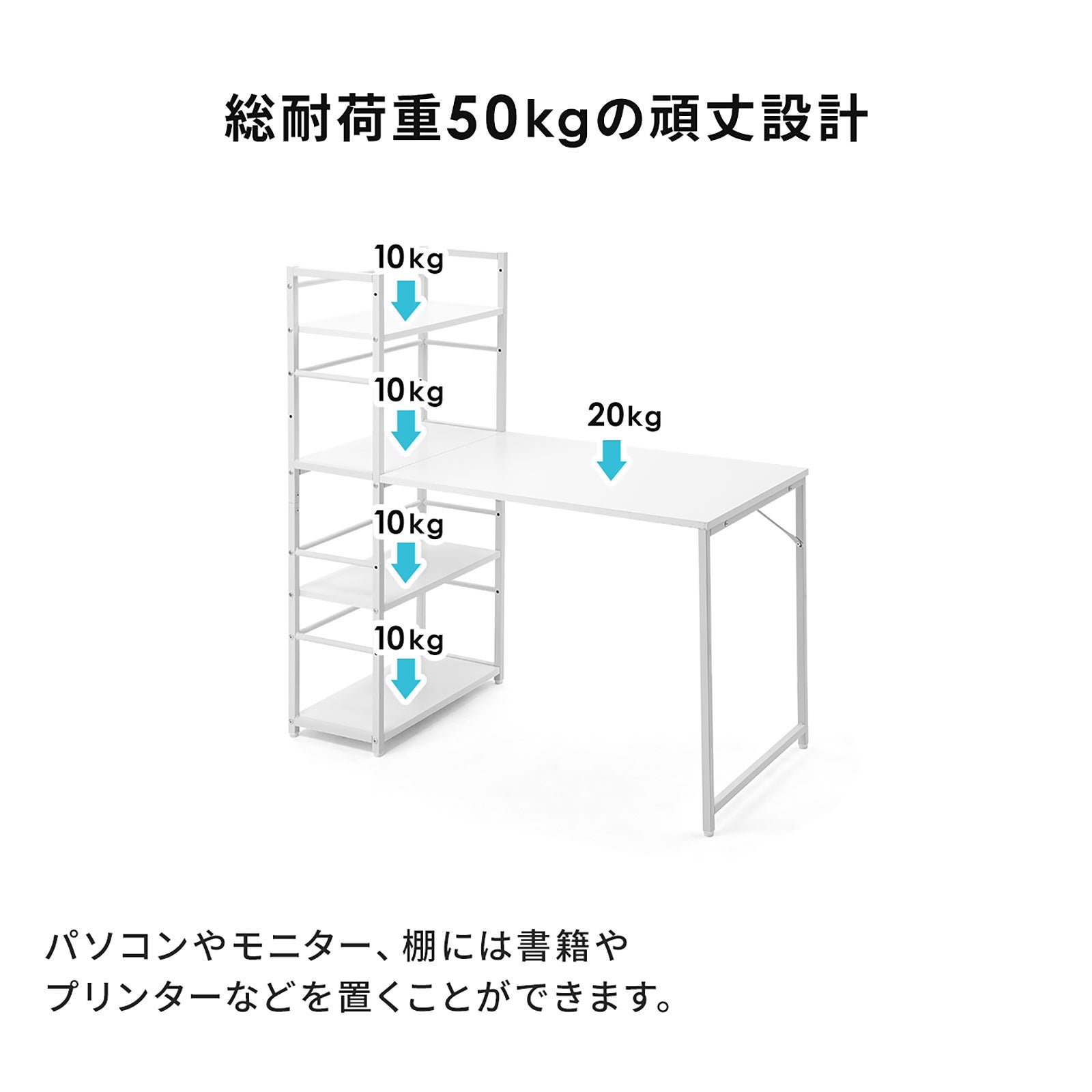 本製品は、デスクにシェルフ収納をプラスしたシェルフデスクで、ワンルームにも置きやすいコンパクトサイズです。勉強机、作業台、書斎デスクなど様々な用途で使用できます。