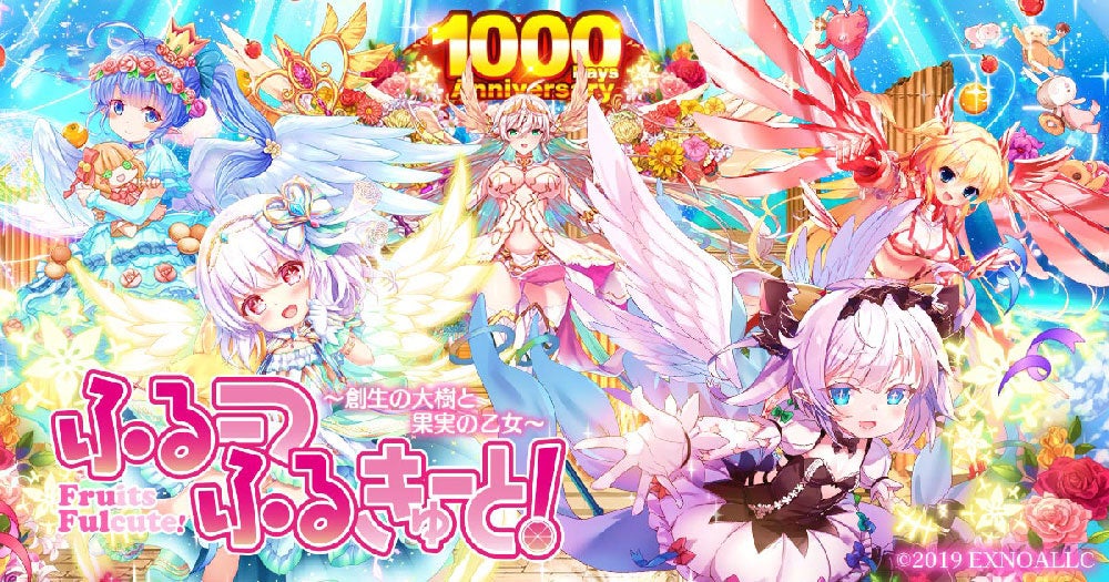 「ふるーつふるきゅーと!~創生の大樹と果実の乙女~」リリース1000日を記念して最大300連無料の毎日20連無料ガチャや創生石1万個以上がもらえるログインボーナスなどお得なキャンペーンを開催中!