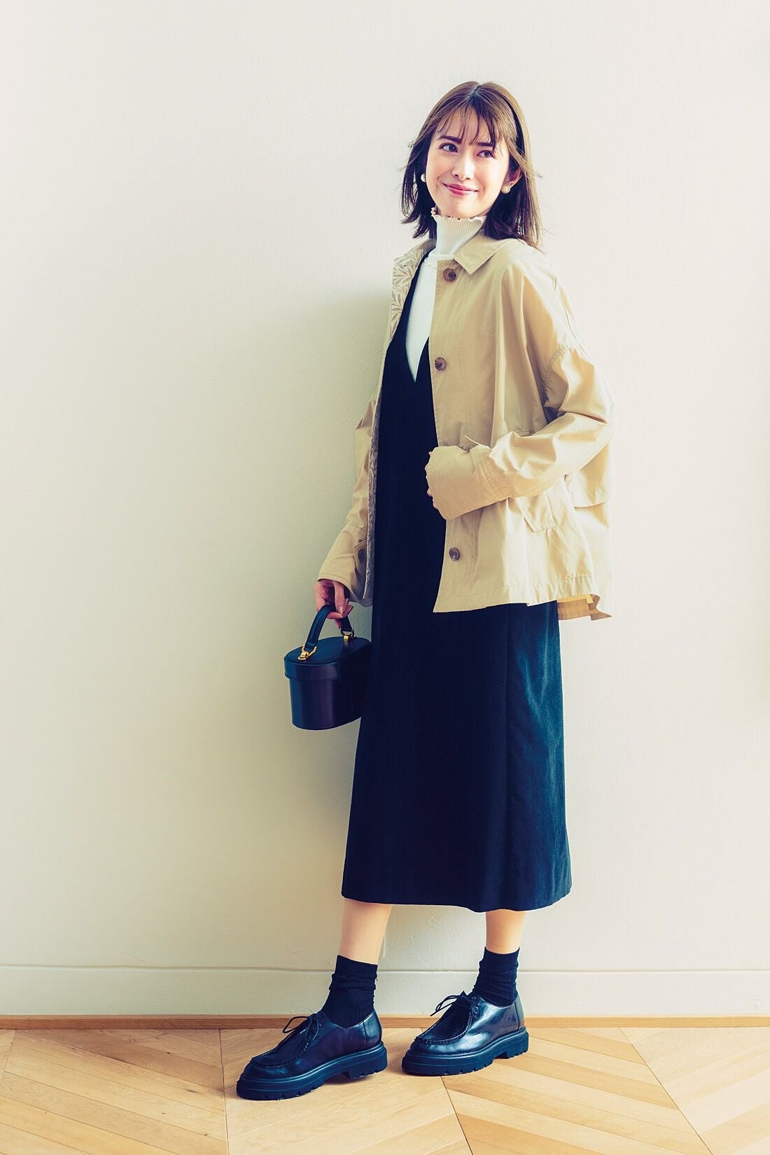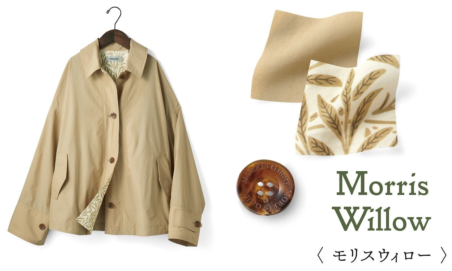 「モリスウィロー」柄を内に秘めた軽やか撥水(はっすい)ショートコートは、きちんときれいな顔立ちながら、着心地はふわっとリクラシーに仕立てられています。たっぷりタックを取ったヨークがこなれ感を演出し、歩くたび、風に揺れてちらっとのぞく「柳の枝」が、春めくポイント。どんな服にも合わせやすい丈感で、急な雨にも対応できる、大人にうれしい機能が満載のショートコートです。