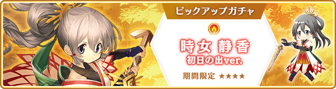 また、本ガチャの開催と合わせて『期間限定 時女静香 初日の出ver.ピックアップガチャ』をお得に引ける『有償限定 時女静香 初日の出ver.ピックアップガチャ』を開始いたしました。