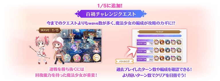 1回のバトルが5〜7の長期WAVEにわたるクエストでチームに3人以上の魔法少女を編成することでプレイできます。百禍チャレンジクエストを全てクリアすると「ガチャチケット」「称号」とマギアストーンを合計75個獲得できます。