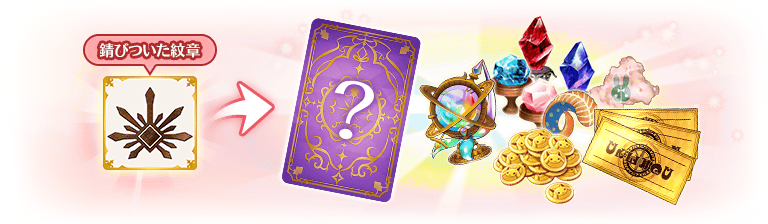 「錆びついた紋章」は「ガチャチケット」や「感情の欠片」等をランダムで獲得することができる「時女拾遺物語 ~初日の出を呼びませう!~ おみくじボックス」で利用することができます。