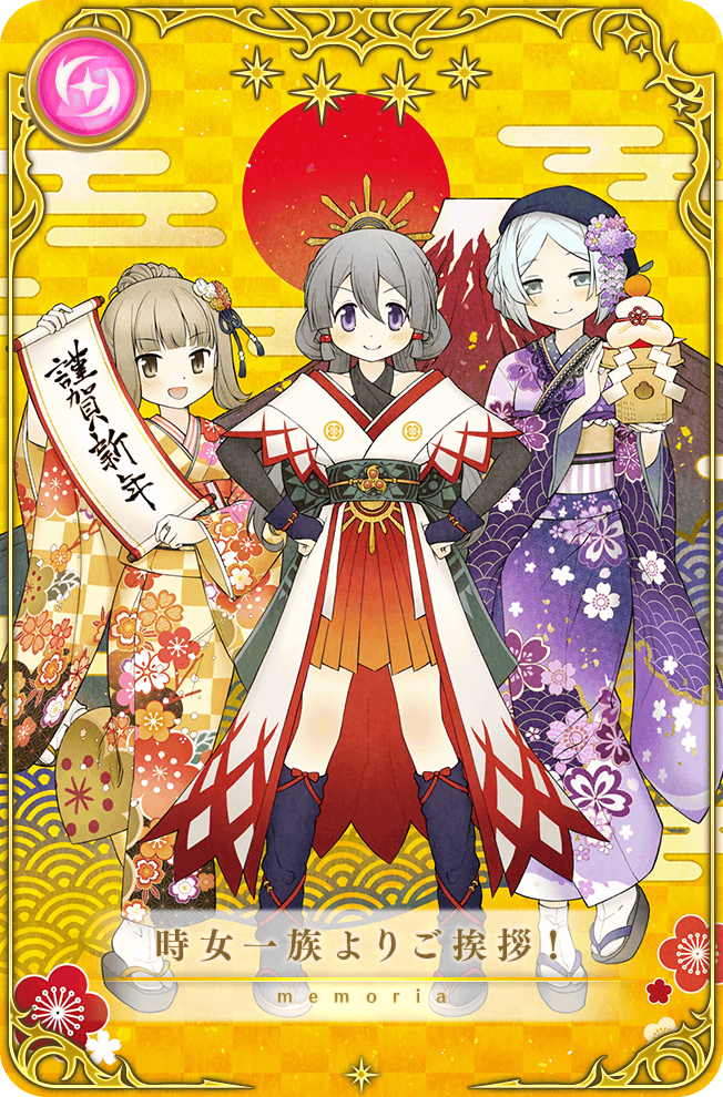 本ガチャより、新魔法少女「時女静香 初日の出ver.」と新メモリア「どんな衣装もお手のもの」「時女一族よりご挨拶!」が期間限定で登場いたしました。