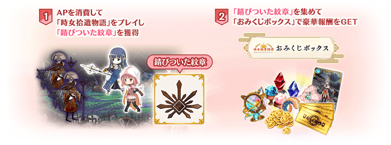 「錆びついた紋章」を消費することで「時女拾遺物語 ~初日の出を呼びませう!~ おみくじボックス」を利用することができます。