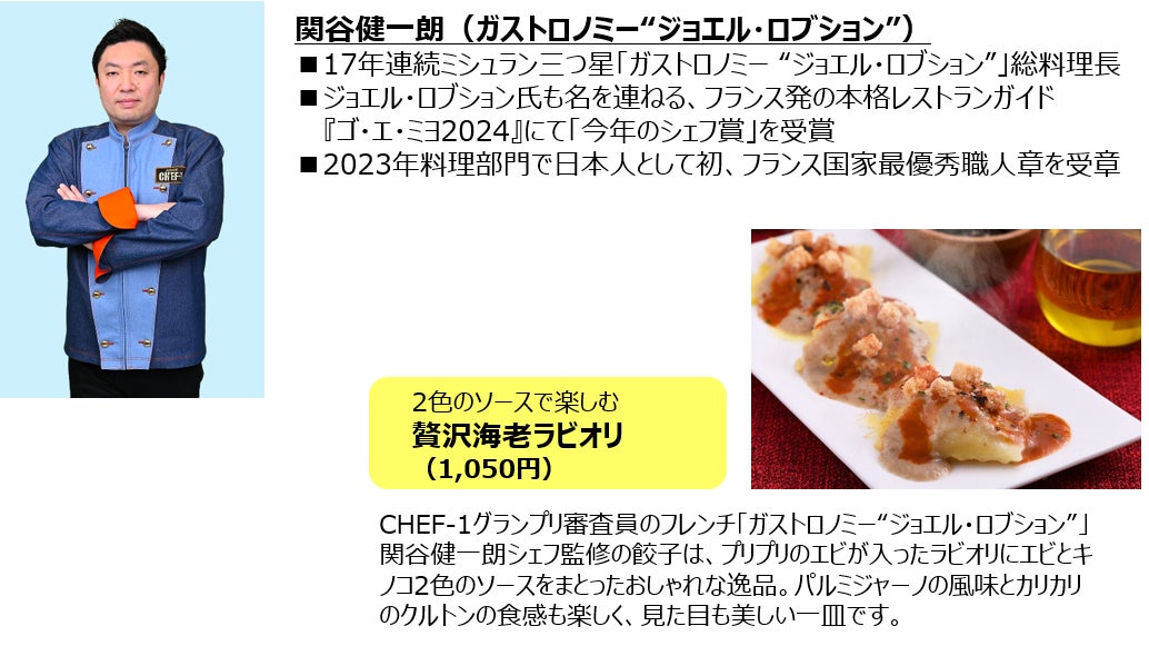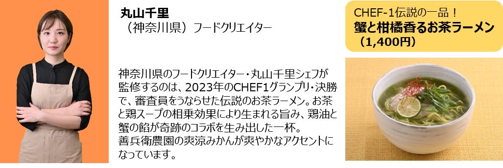 「CHEF-1グランプリ審査員監修スペシャル餃子」餃子メニューのほか、昨年の『CHEF-1グランプリ2023』決勝で審査員をうならせた丸山千里シェフ監修の“伝説のお茶ラーメン”も出店することが決定しました。