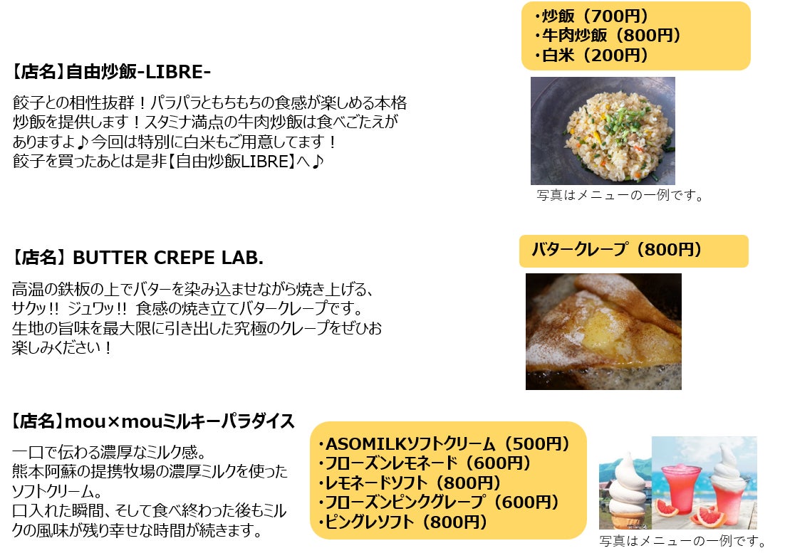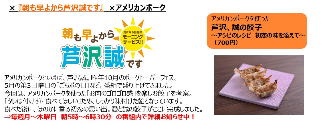 テレビから『おはよう朝日 土曜日です』が『CHEF-1グランプリ』2代目王者・大原シェフと開発した餃子を、『なるみ・岡村の過ぎるTV』は“大阪王将”とのコラボを果たし、ラジオからは朝の名物2番組『朝も早よから芦沢誠です』『きっちり!まったり!桂吉弥です』が、“アメリカンポーク”とコラボした餃子を出店します。