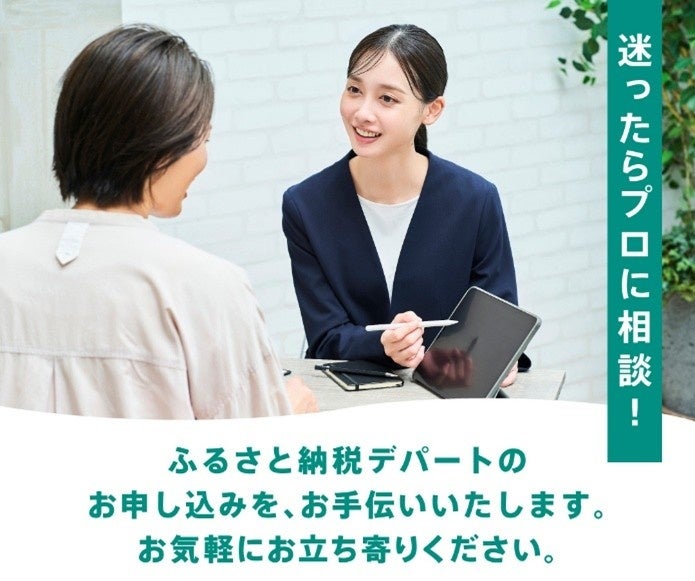 サービス開始にあわせて、大丸福岡天神店 東館地下2階に、期間限定のお申込み相談カウンターを開設します。ふるさと納税デパートでの返礼品の選び方から申込方法までスタッフが丁寧にサポートいたします。